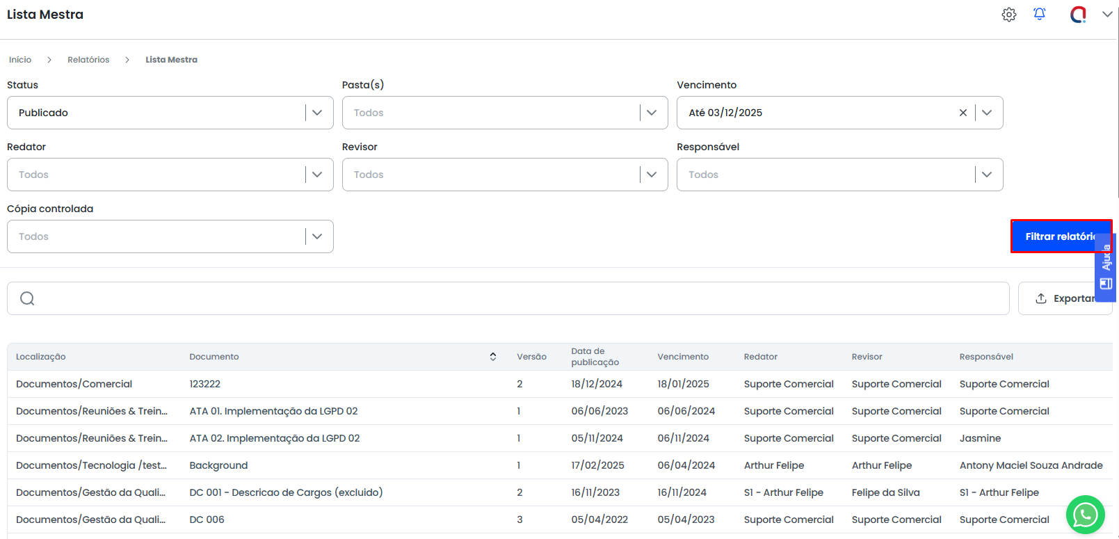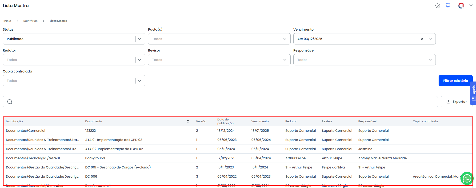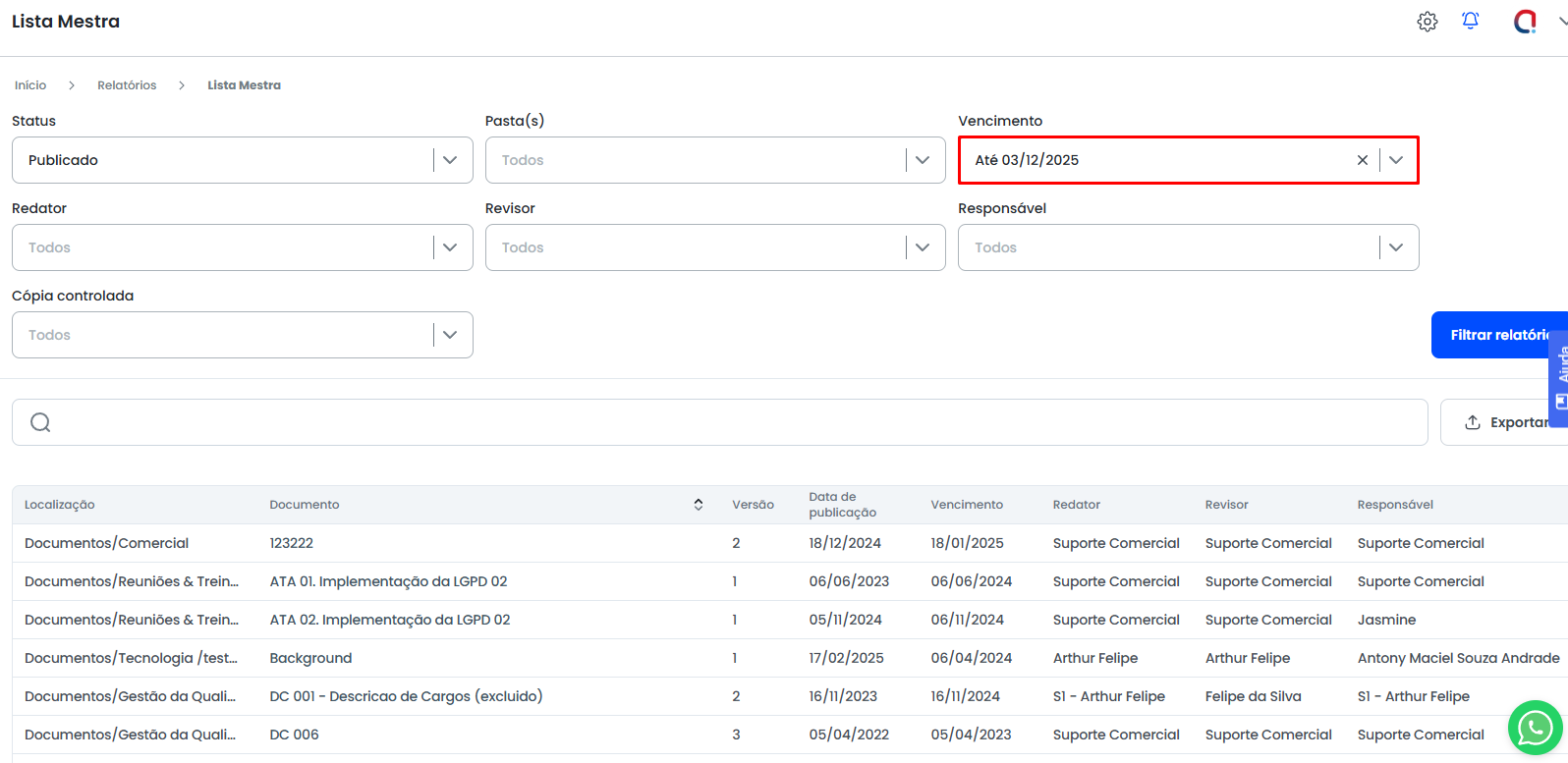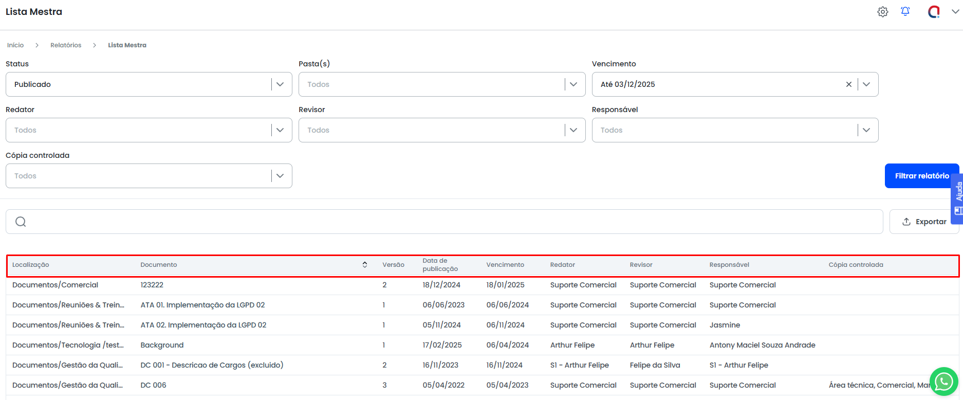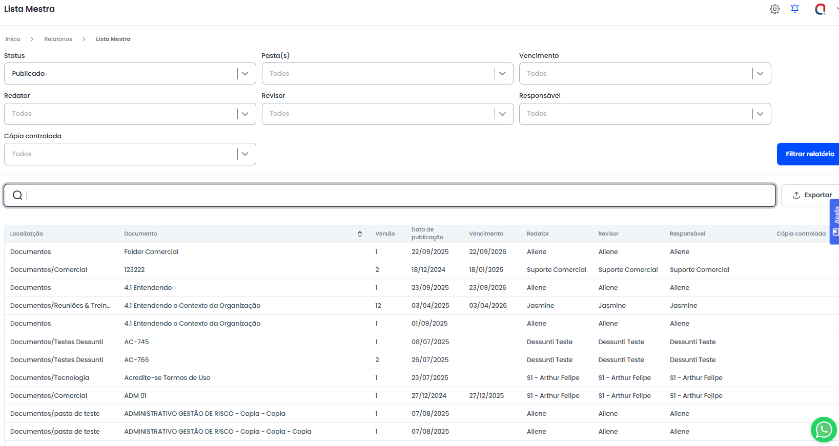 A lista de documentos exibirá as seguintes colunas de informação: Localização, Nome do Documento, Número de Versão, Data de Publicação, Vencimento, Redator, Revisor, Responsável e onde a Cópia Controlada está distribuída.