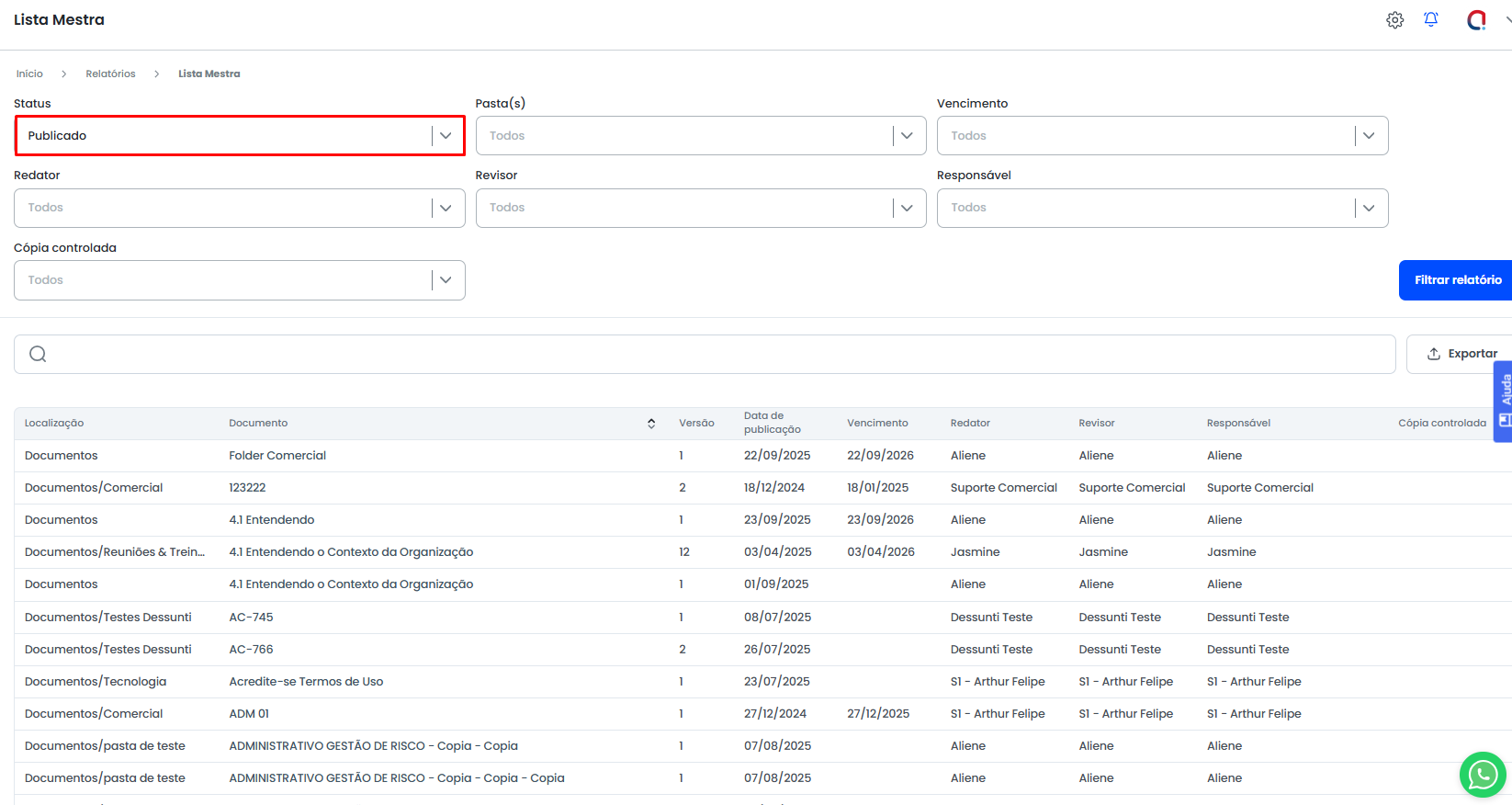 Na opção Status, o usuário pode selecionar quais documentos serão apresentados na Lista Mestra. As opções de listagem são: Documentos Publicados, Documentos Arquivados, Documentos em Redação, Documentos em Revisão e Documentos em Publicação.