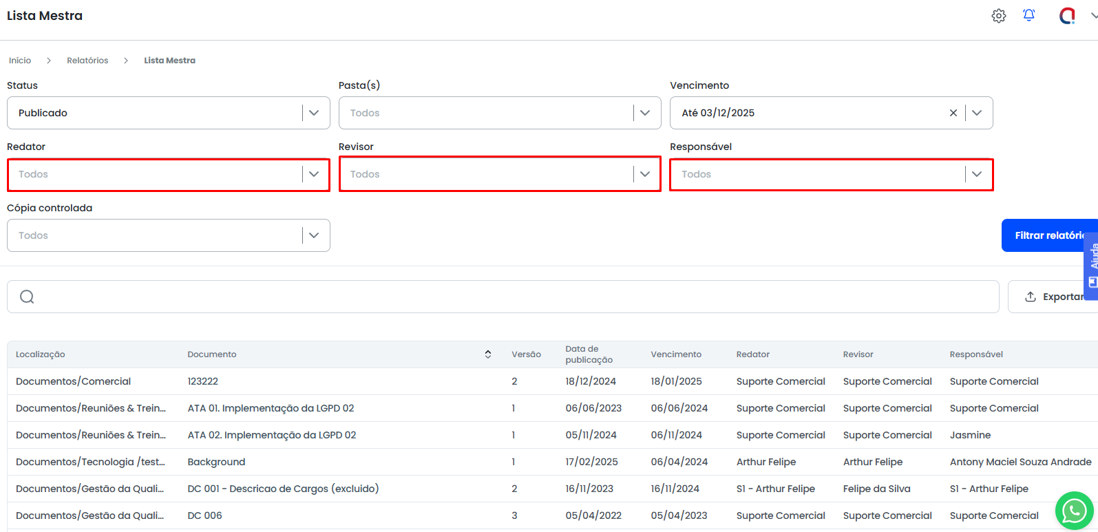 O usuário também terá a possibilidade de filtrar os documentos pelo nome do redator, do revisor ou do responsável (publicador).