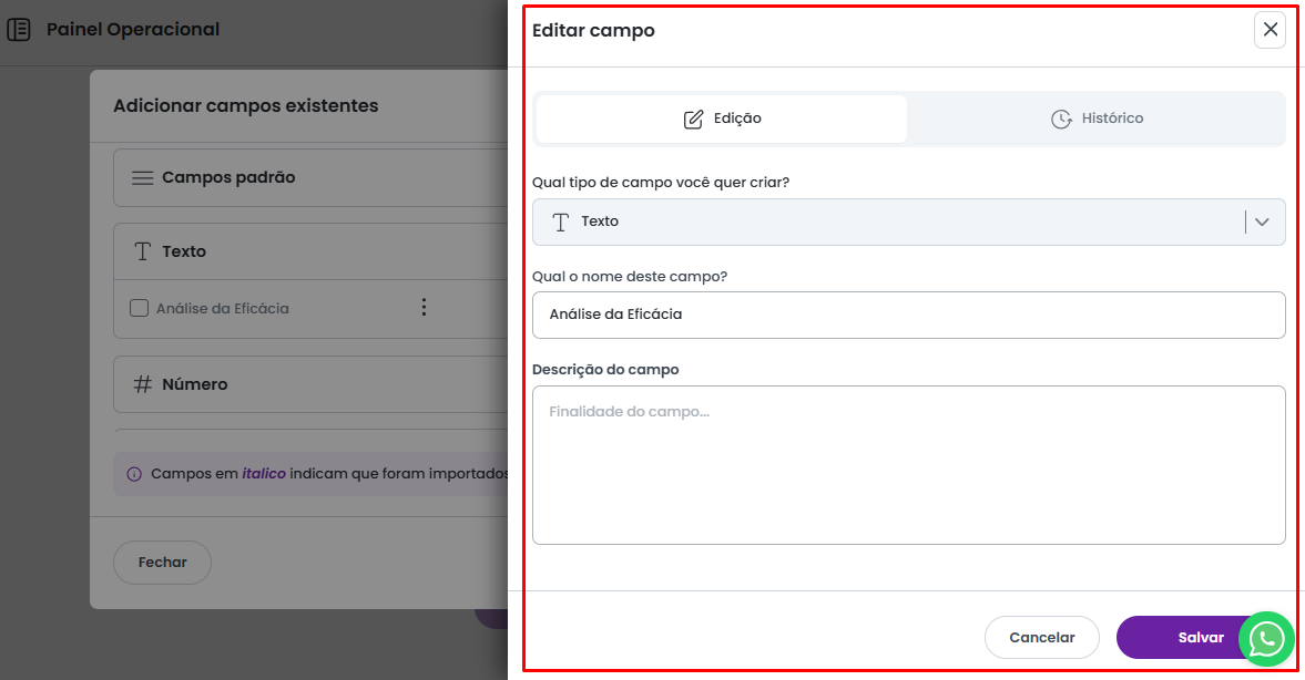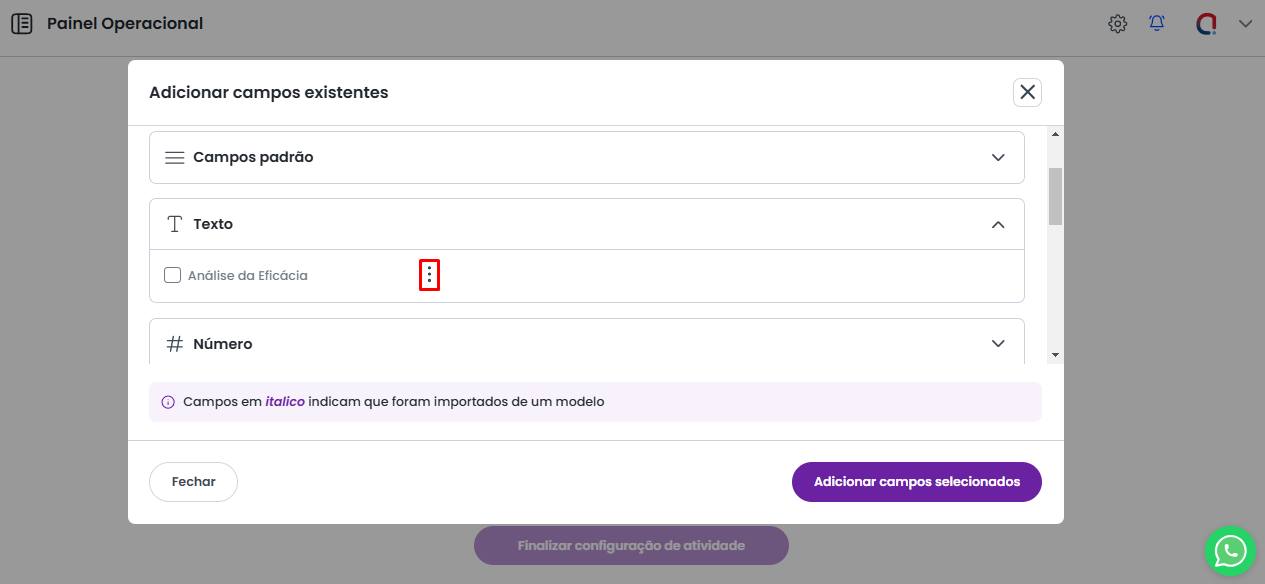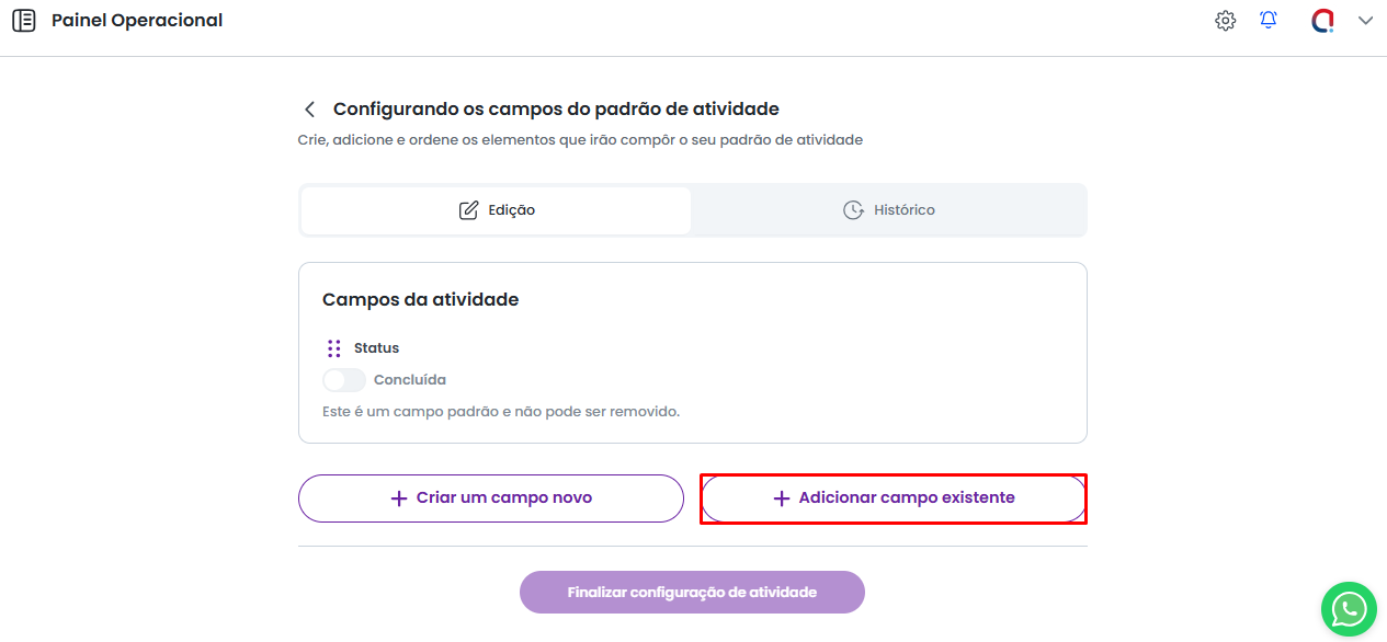 Para alterar o nome de algum campo, acesse a tela de Personalização do Padrão de Atividade e selecione a opção Adicionar Campo Existente.
