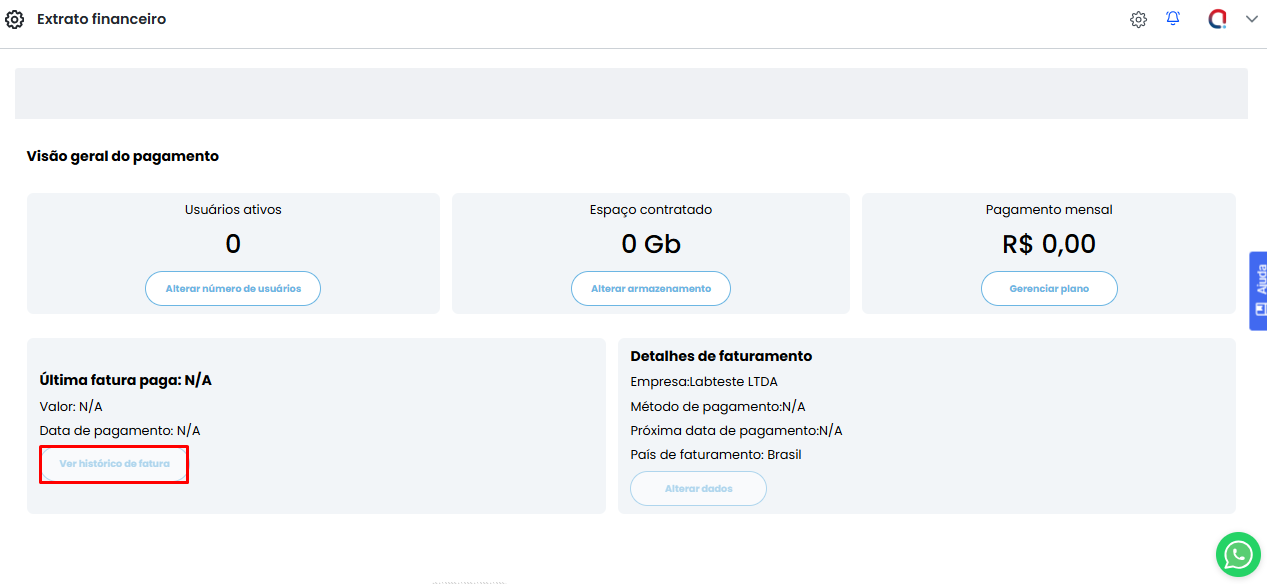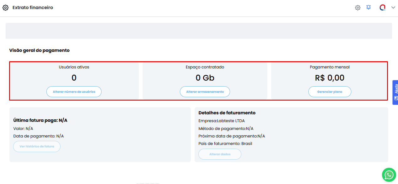 No Extrato Financeiro, é possível visualizar a quantidade de usuários ativos contratados, o espaço de armazenamento disponível e o valor da mensalidade atual.