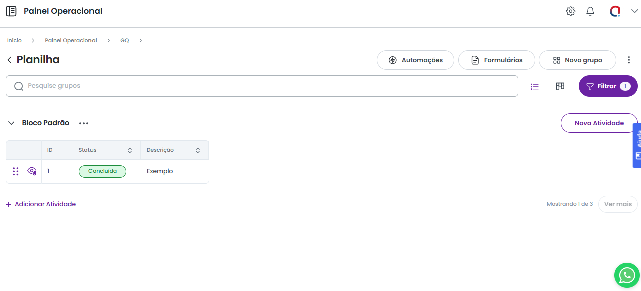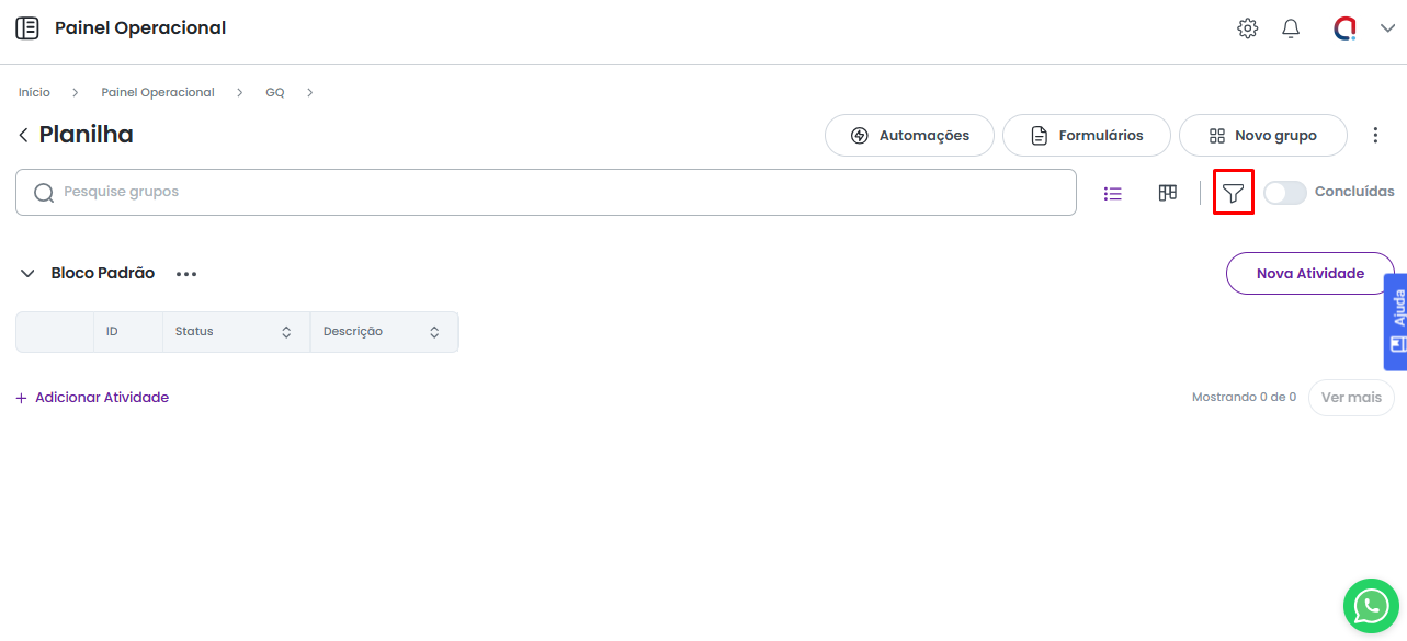 A função de Filtrar permite filtrar as atividades criadas na planilha com base em um campo e informação específicos, facilitando a localização e a análise dos registros desejados.