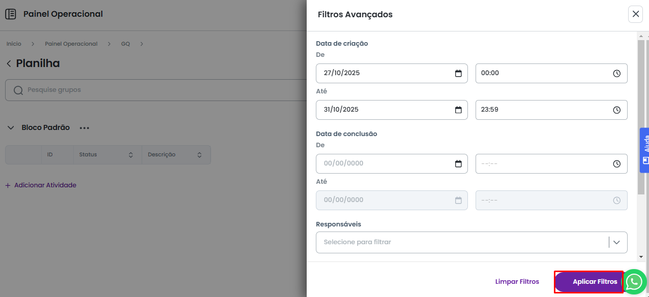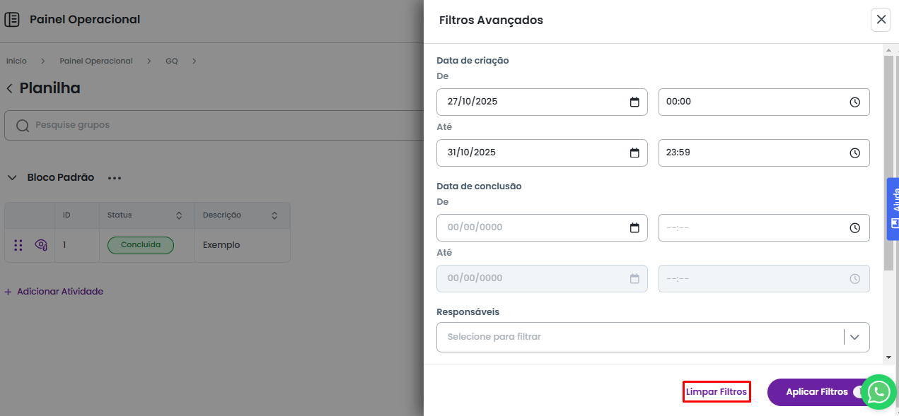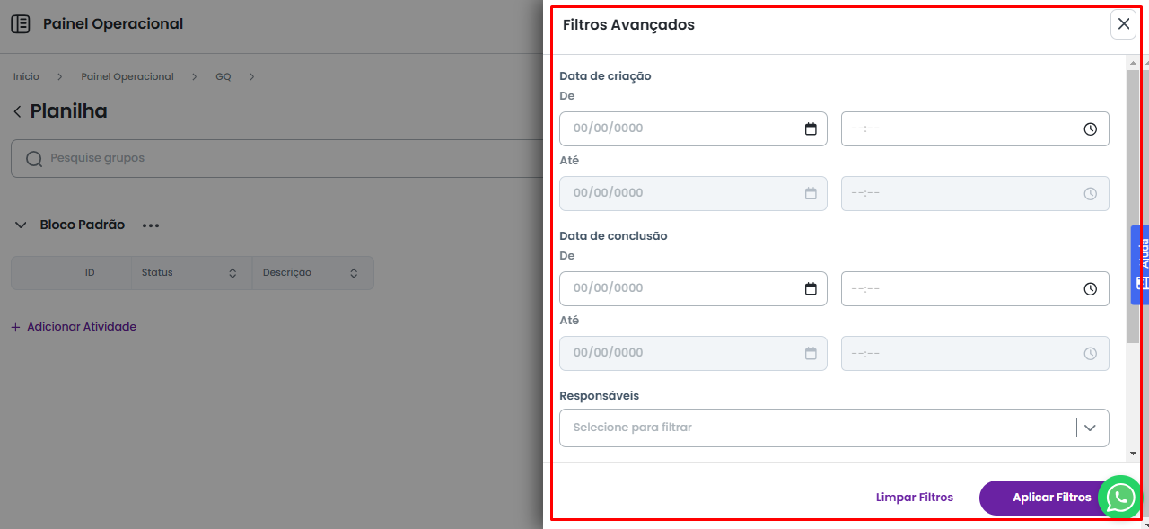 Feito isso, será aberto um painel lateral com todas as opções de filtragem. Este painel exibe todos os campos definidos no modelo padrão de atividade, além das opções de filtragem padrão, como: Data de Criação, Data de Conclusão, Responsáveis e Status.