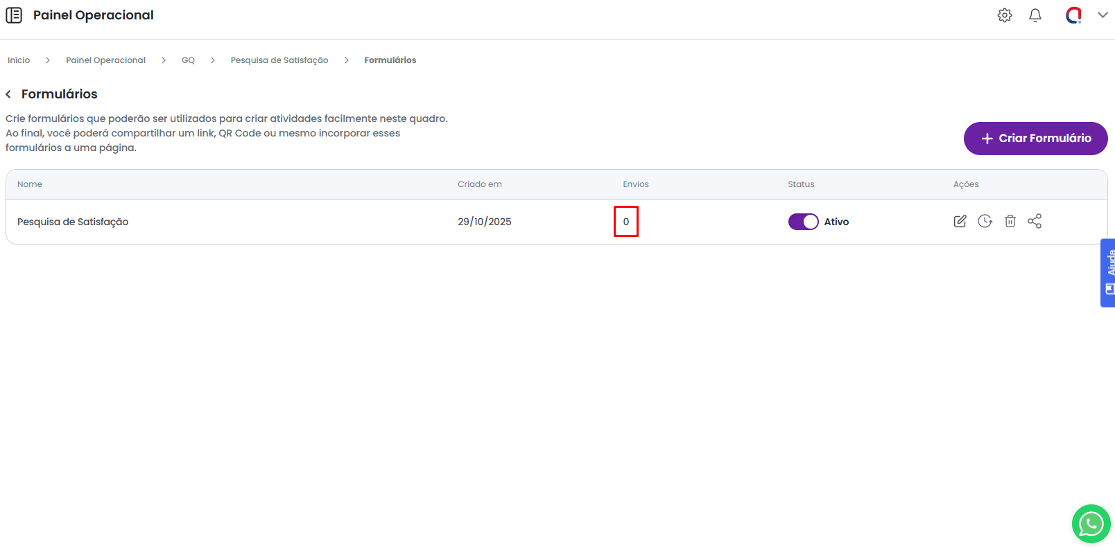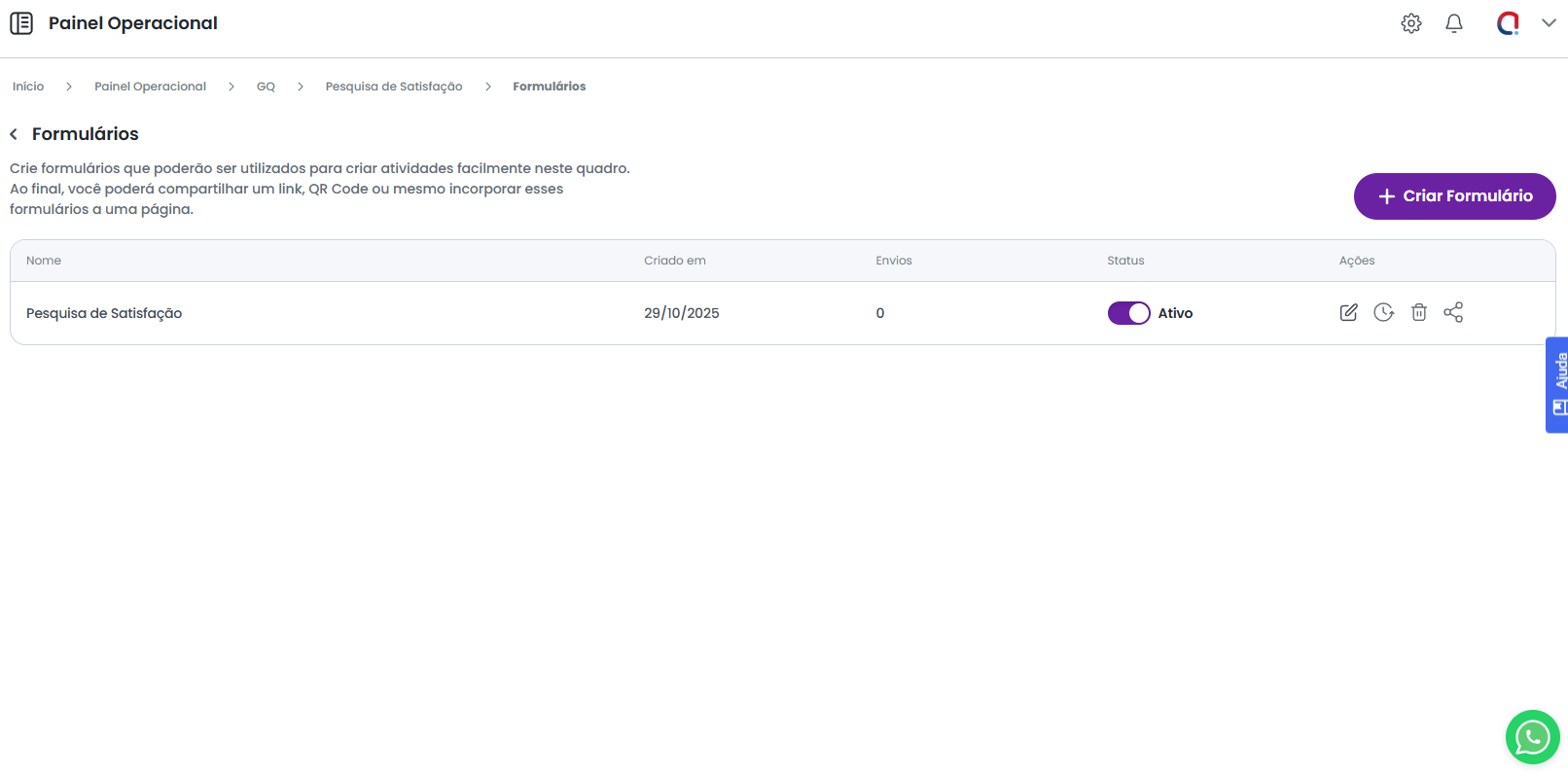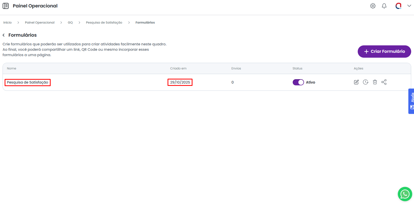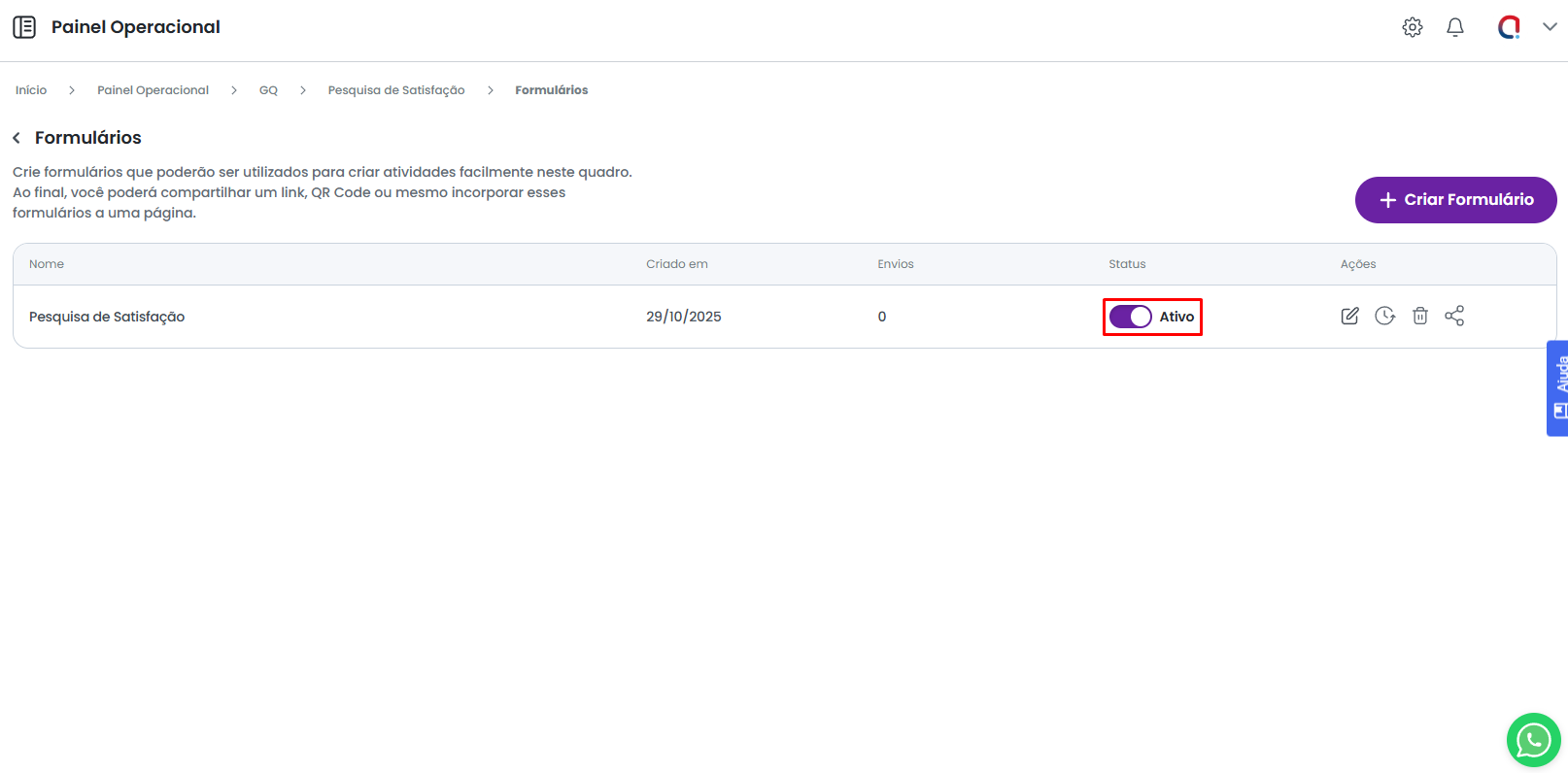 A opção Status permite a inativação e reativação do formulário. Após ser reativado, tanto o QR Code quanto o Link de acesso voltam a funcionar normalmente, sem a necessidade de emitir novos códigos ou links.