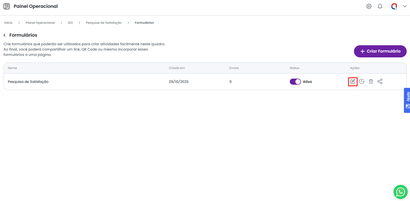 A opção Editar permite que você altere as configurações realizadas no formulário. É importante notar que o QR Code e o Link de acesso não serão alterados após a edição do formulário.