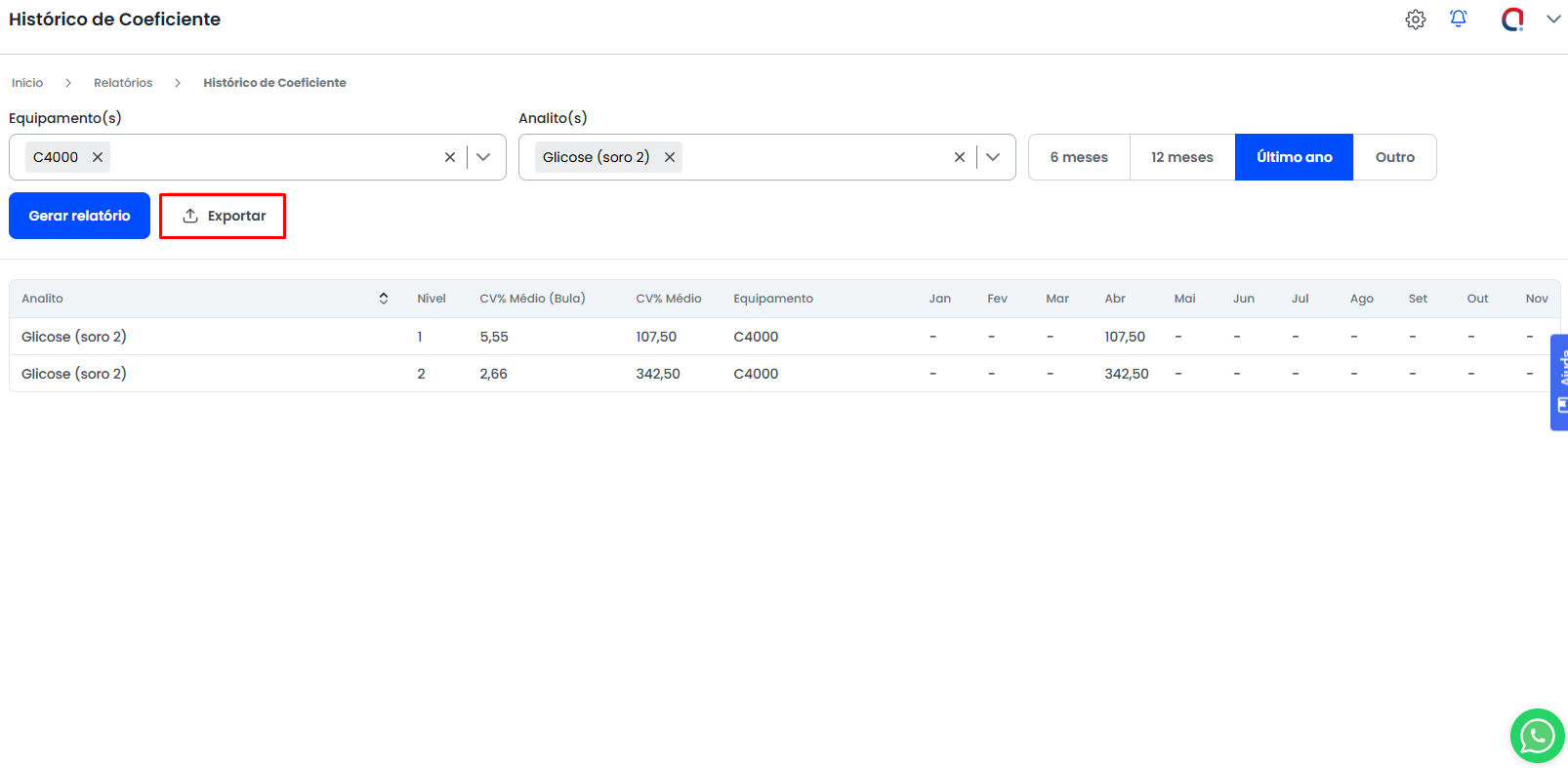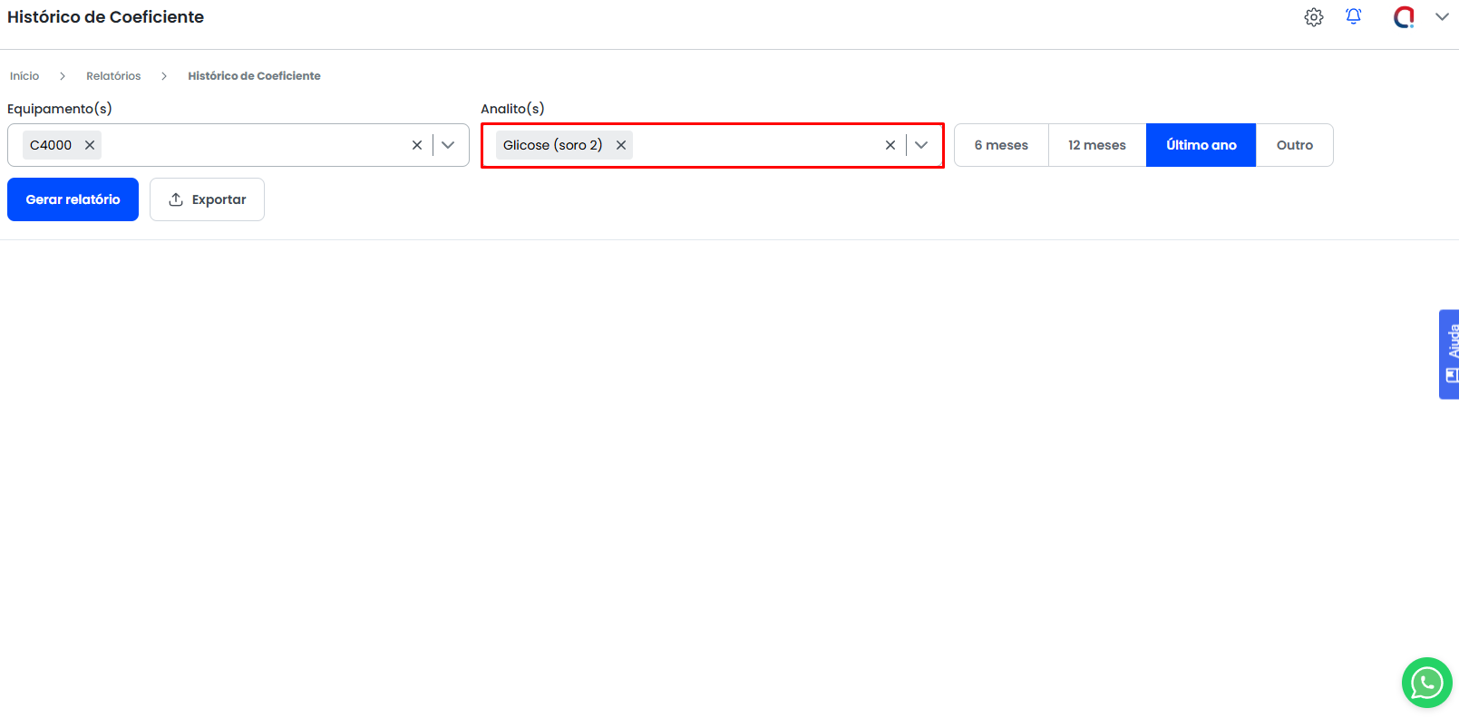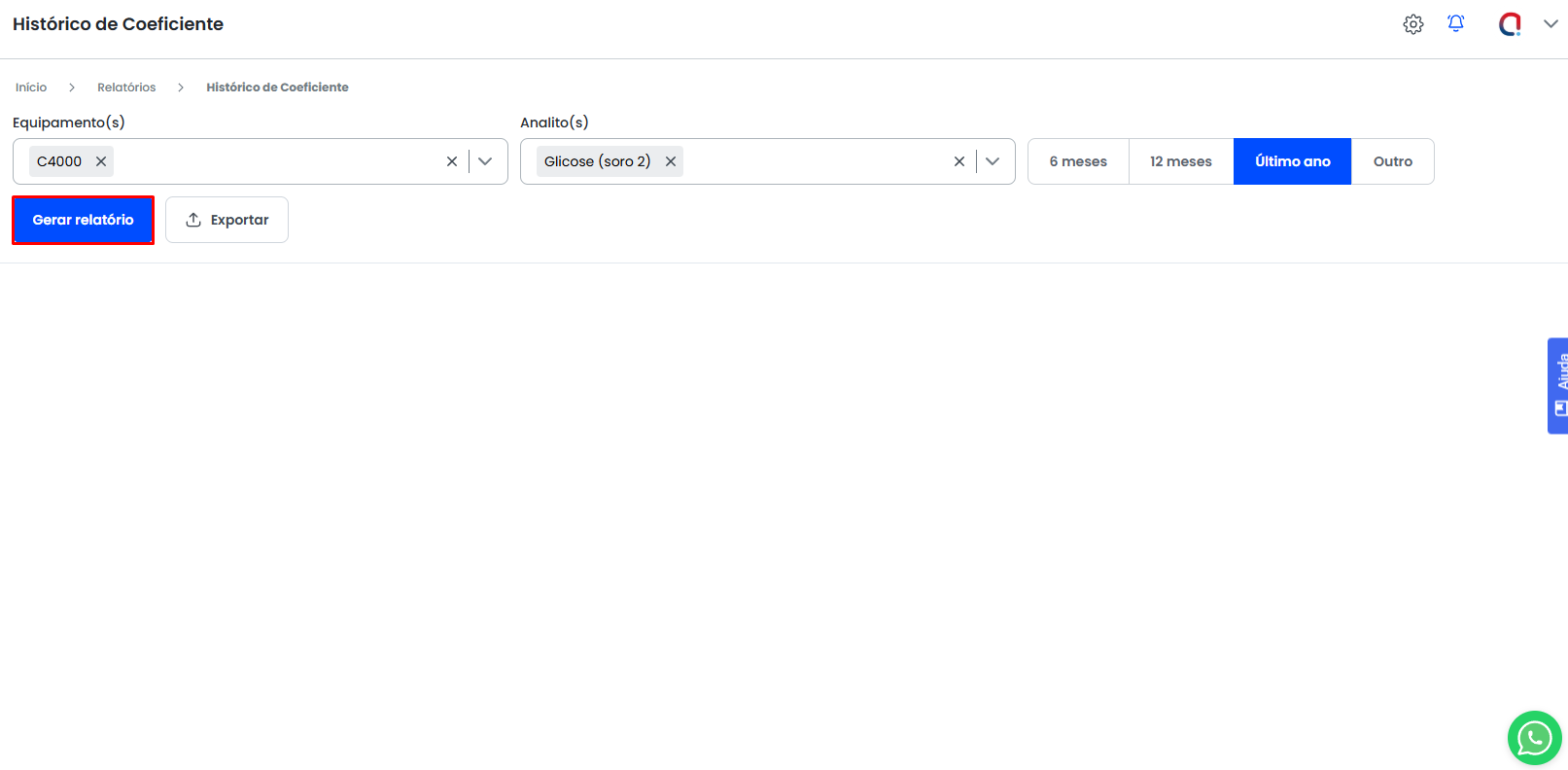 Feito a escolha dos equipamentos e seus analitos, o usuário deve utilizar a opção Gerar Relatório para que o sistema traga o histórico de coeficiente.