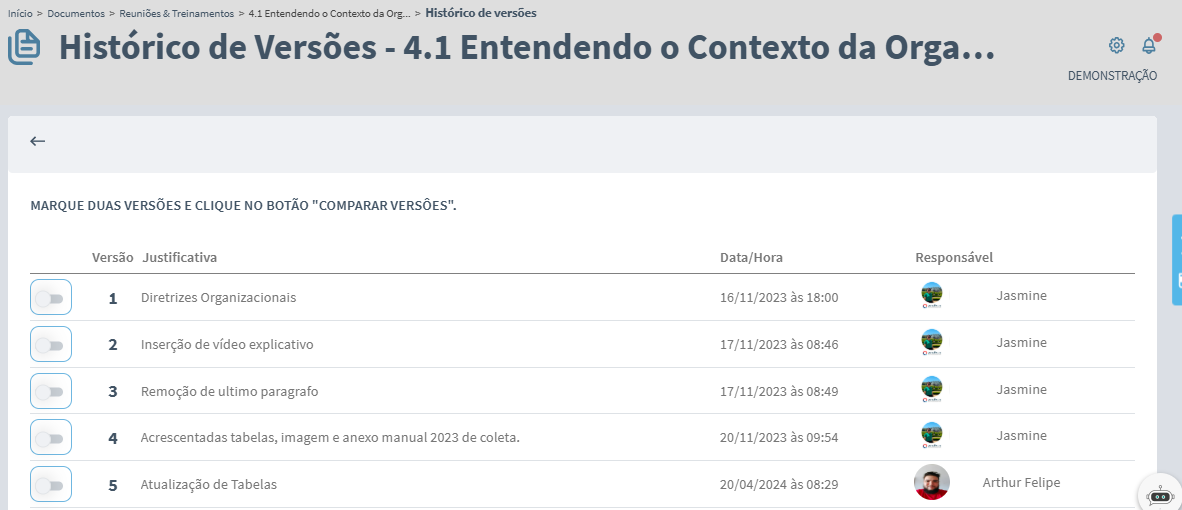 Além disso, é possível selecionar versões específicas para realizar uma comparação entre elas, o que facilita a identificação das alterações realizadas e garante que os colaboradores estejam cientes das atualizações mais recentes. Para isso, basta selecionar duas versões desejadas e, em seguida, utilizar a opção "Comparar Versões" para que o sistema apresente as diferenças entre os conteúdos.