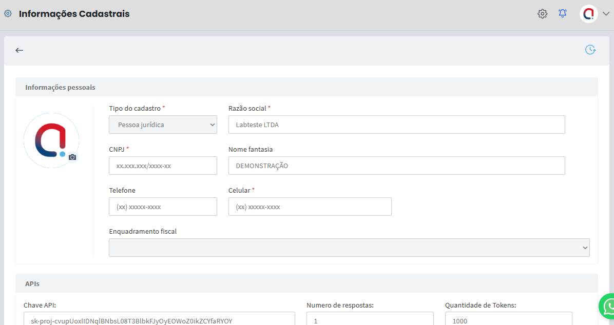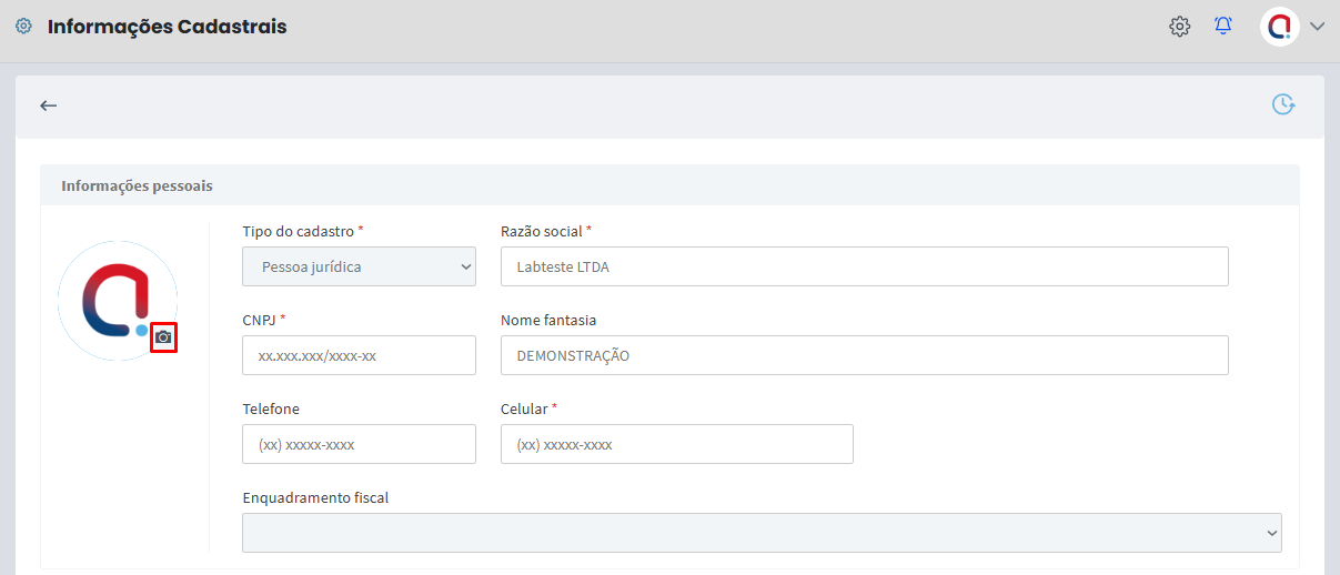 Nessa tela, é possível definir a logomarca da empresa, que será utilizada na impressão de documentos, relatórios e no registro de atividades.Para fazer isso, selecione o ícone de câmera ao lado da foto atual e escolha uma imagem. A imagem deve ter, no máximo, 1000x1000 pixels. Recomenda-se utilizar imagens na proporção 1:1 para obter melhor nitidez.