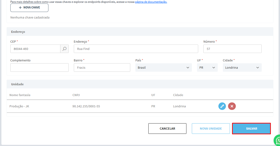Você também pode criar uma nova unidade da empresa utilizando a opção Nova Unidade.
