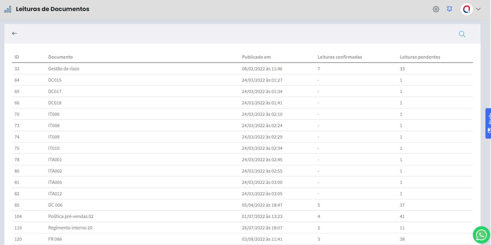 A listagem trará informações de cada documentos, como ID, nome do documento, data de publicação, leituras confirmadas e as leituras pendentes. Ao selecionar o nome de uma coluna, a lista será ordenada a partir dela.