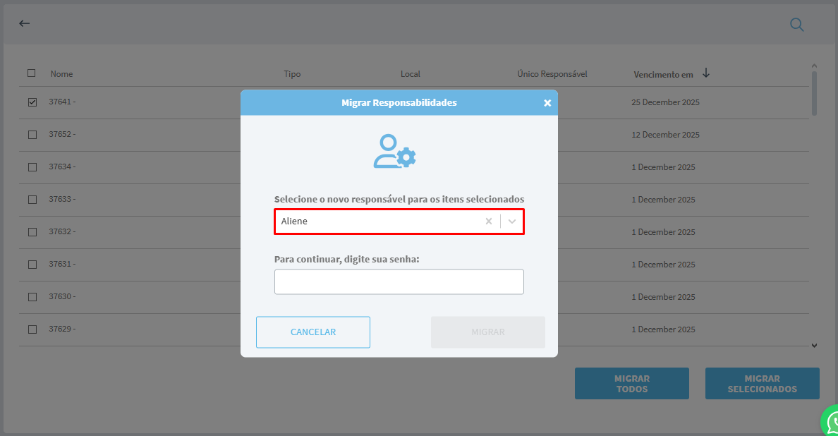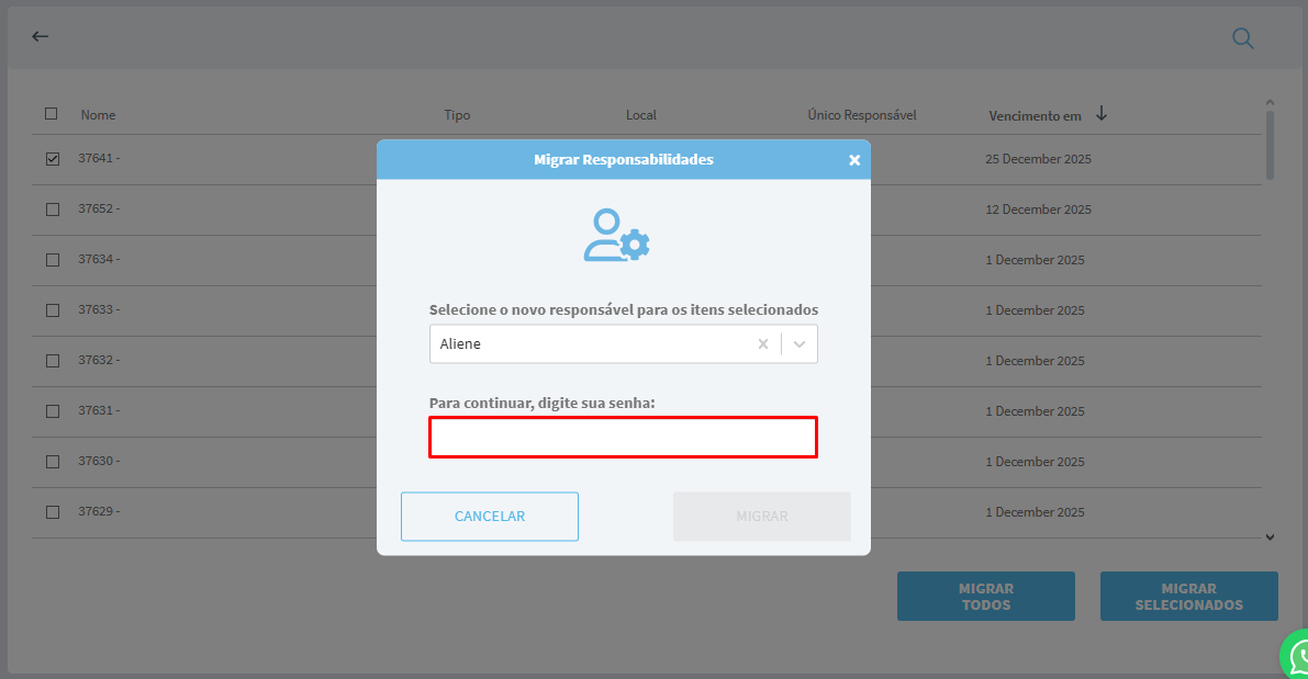 Após definir o novo responsável, você deve informar sua senha de acesso para confirmar a migração.