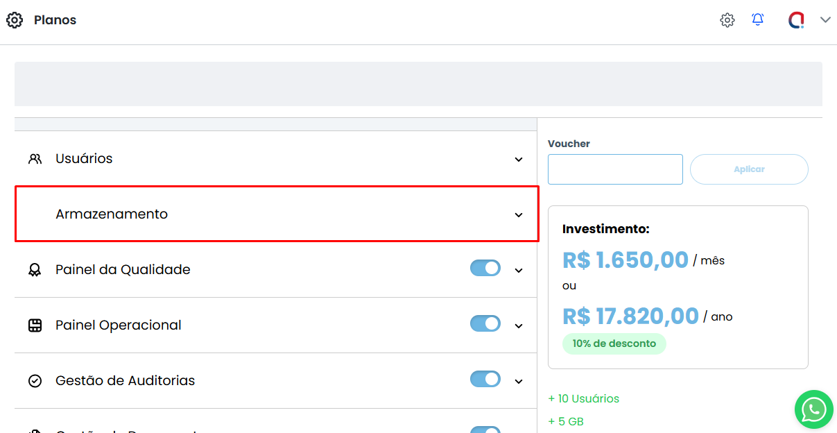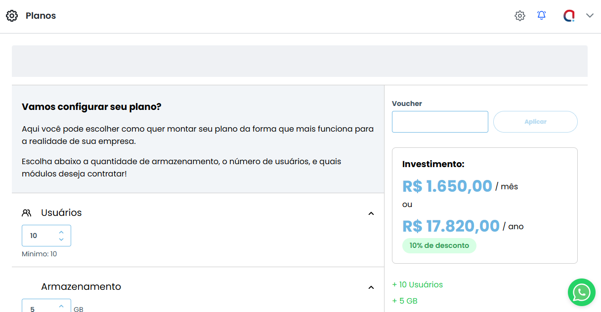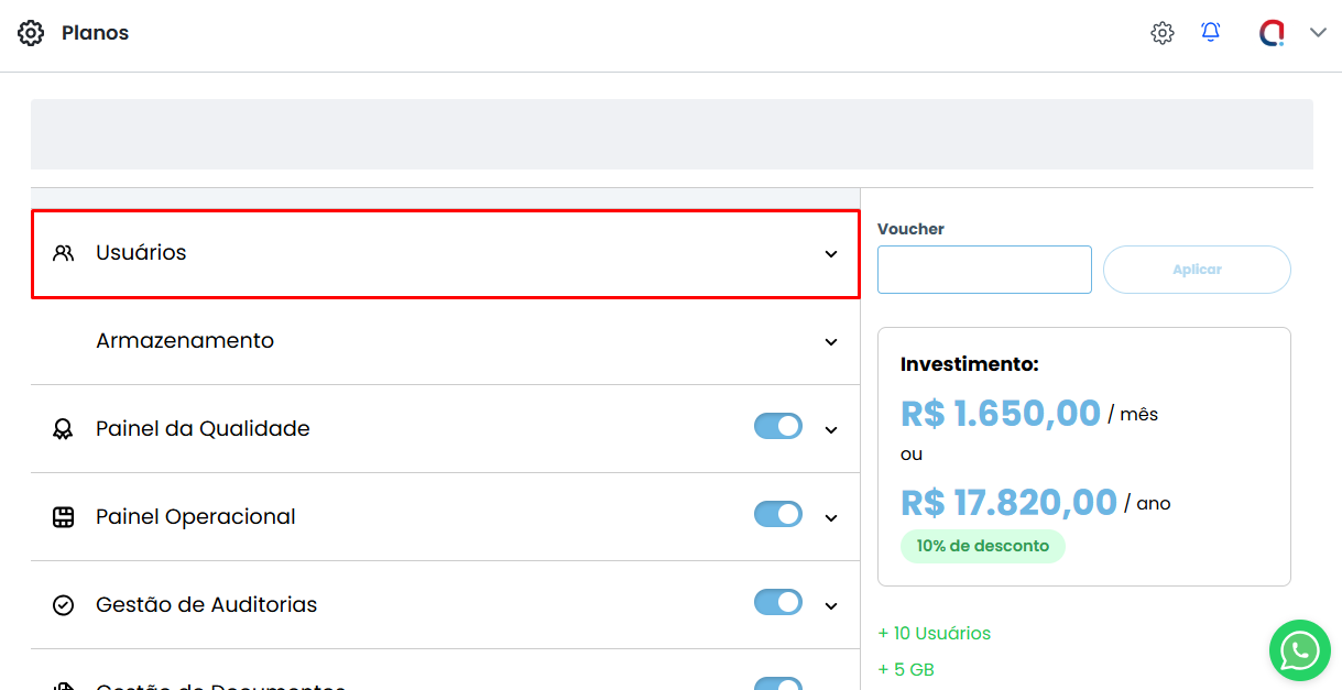 Em Usuários, é possível aumentar ou diminuir a quantidade de acessos disponíveis de acordo com a necessidade.