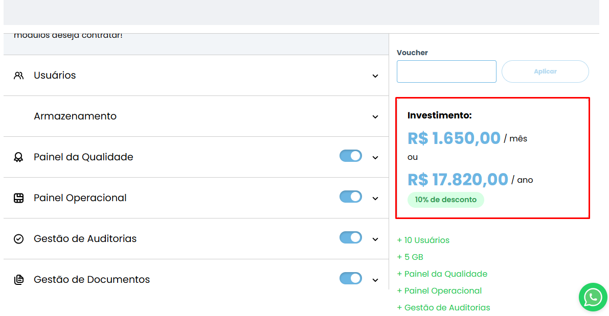 Nesta tela, é possível gerenciar os módulos contratados e a quantidade de usuários disponíveis no sistema.