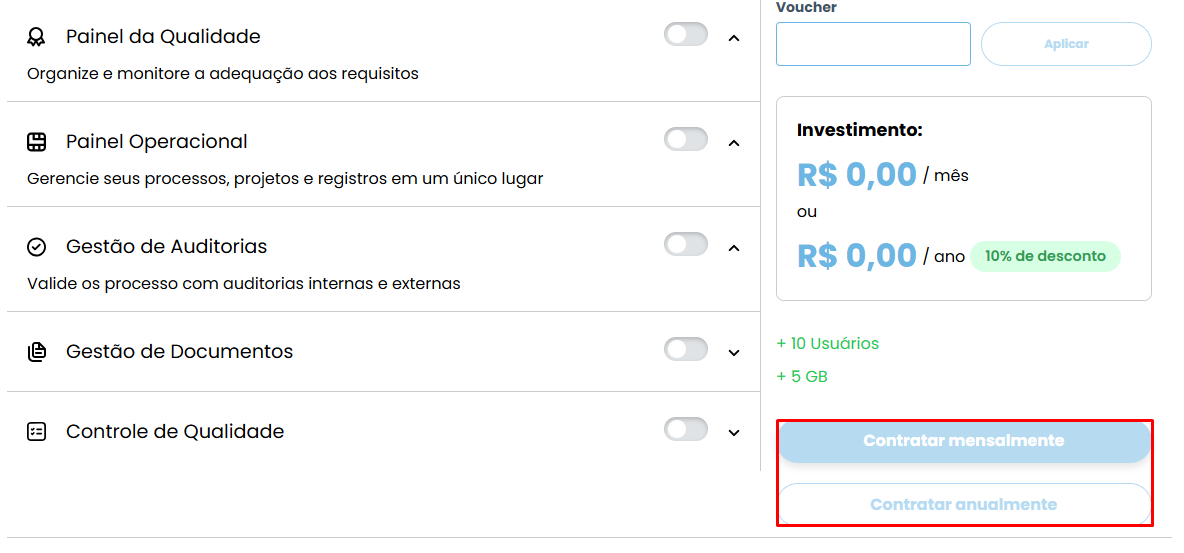 Ao final da tela, haverá a opção para realizar a contratação do plano mensal ou do plano anual.