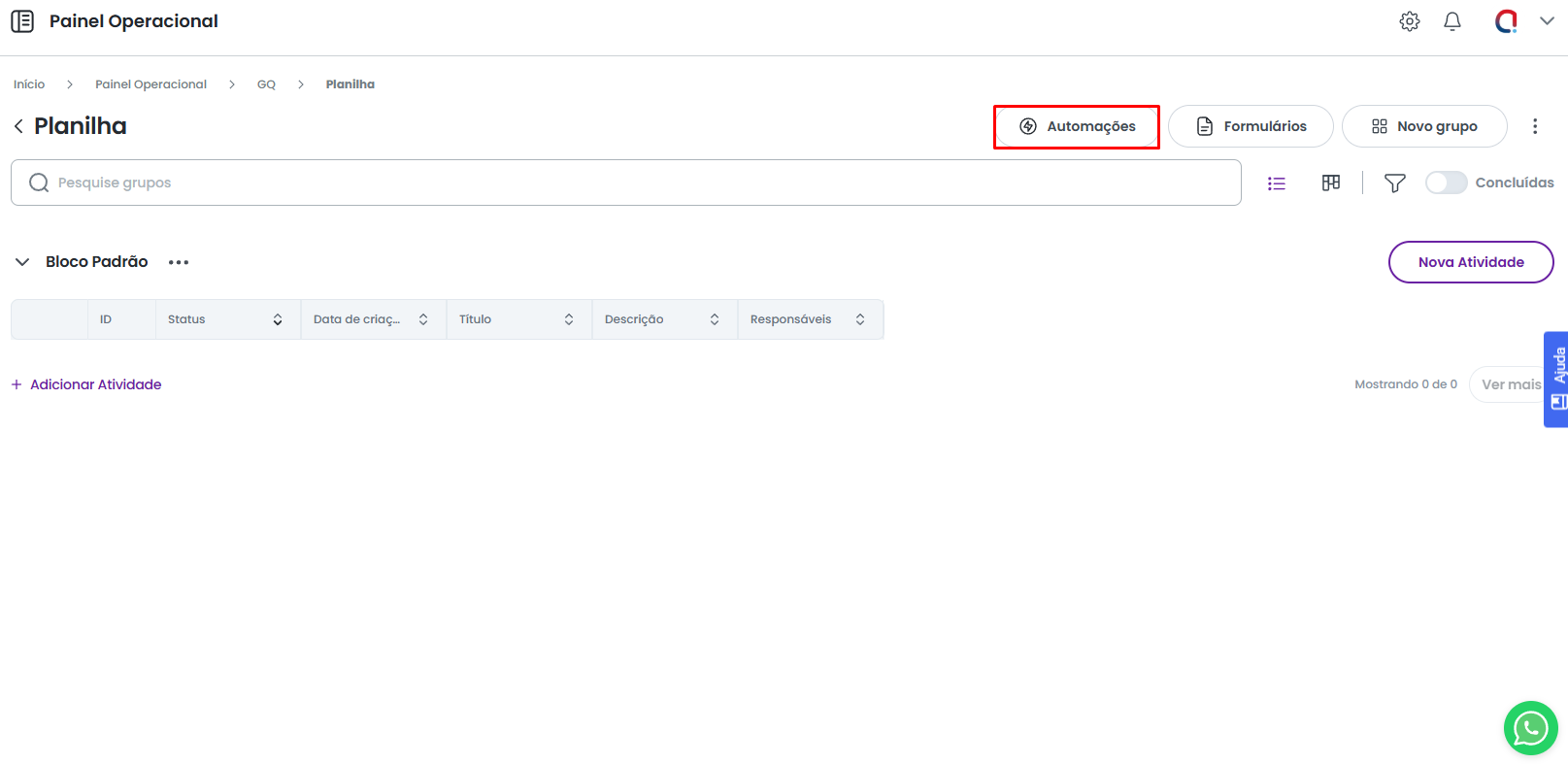 A opção Automações permite ao usuário criar novas automações para a planilha e gerenciar todas as automações que já foram criadas.