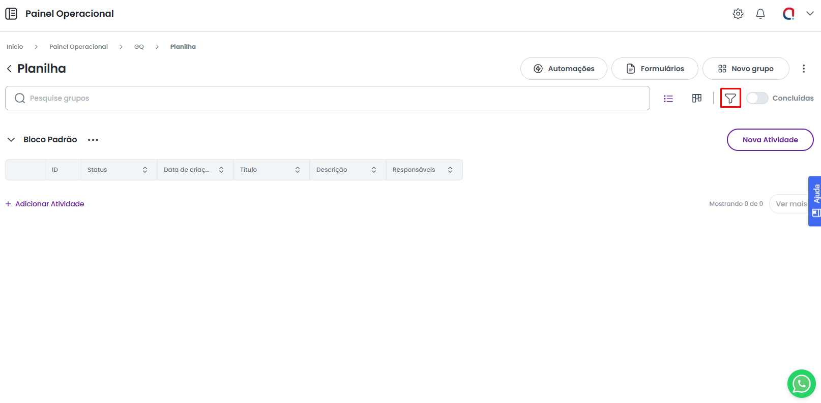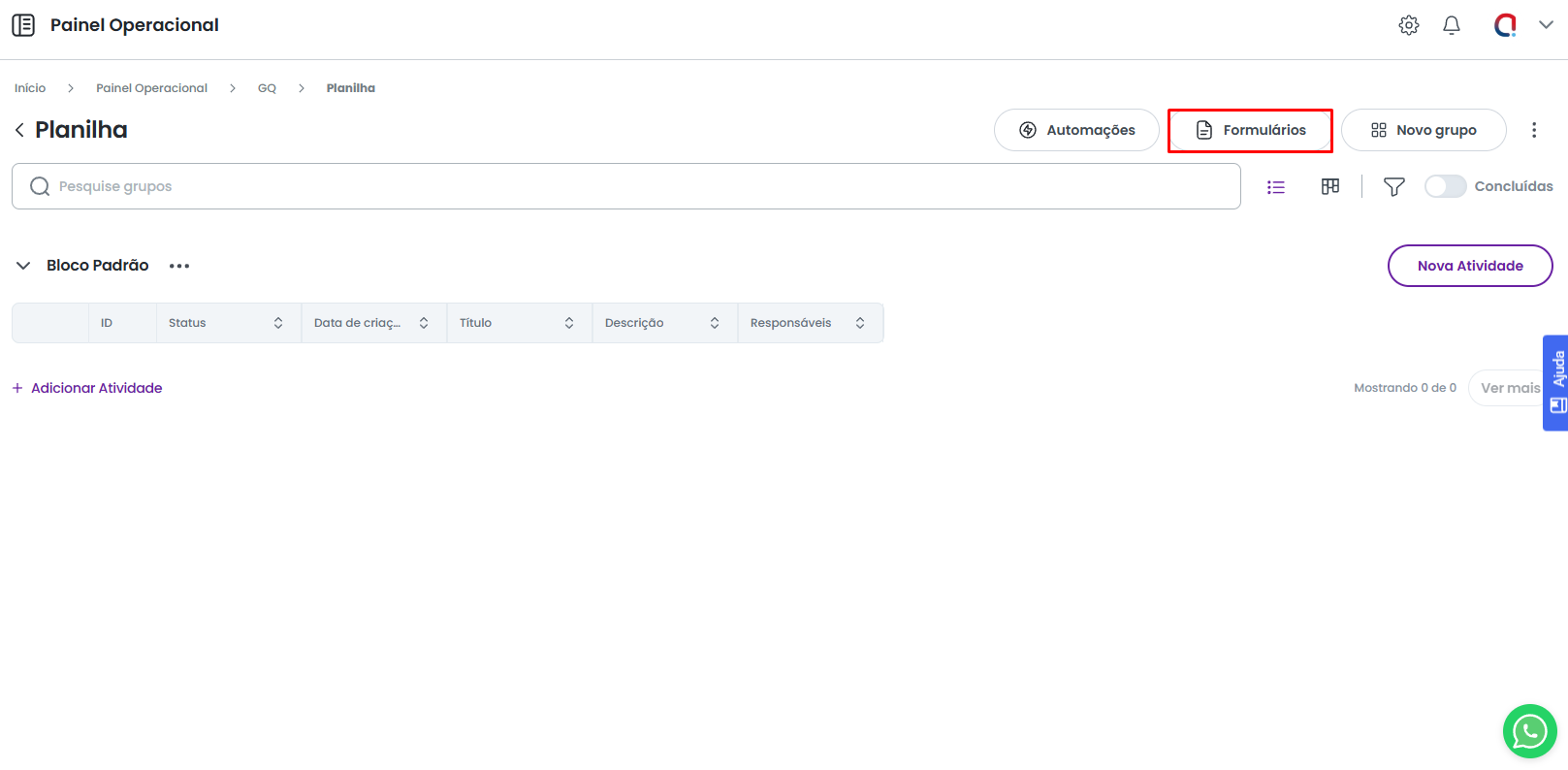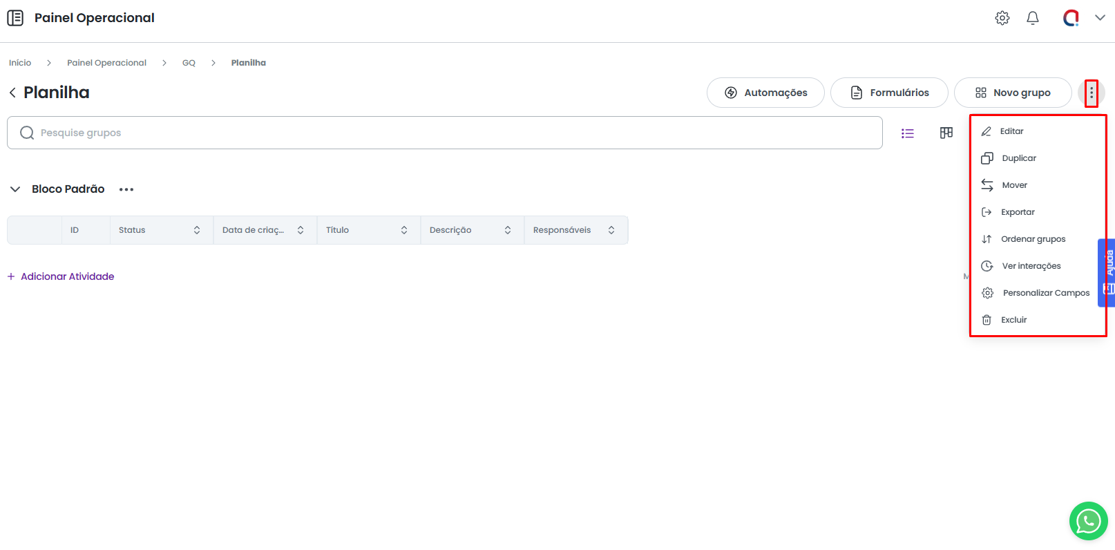 Excluir: Remove a planilha. Para que a exclusão seja liberada, é necessário que todas as atividades, automações, formulários e grupos tenham sido removidos ou movidos para outra planilha.