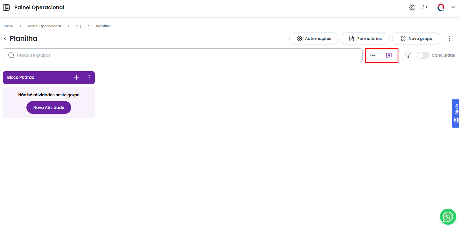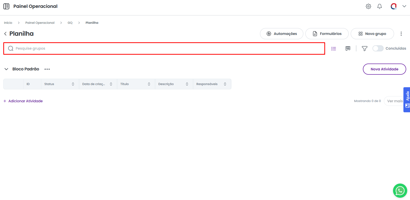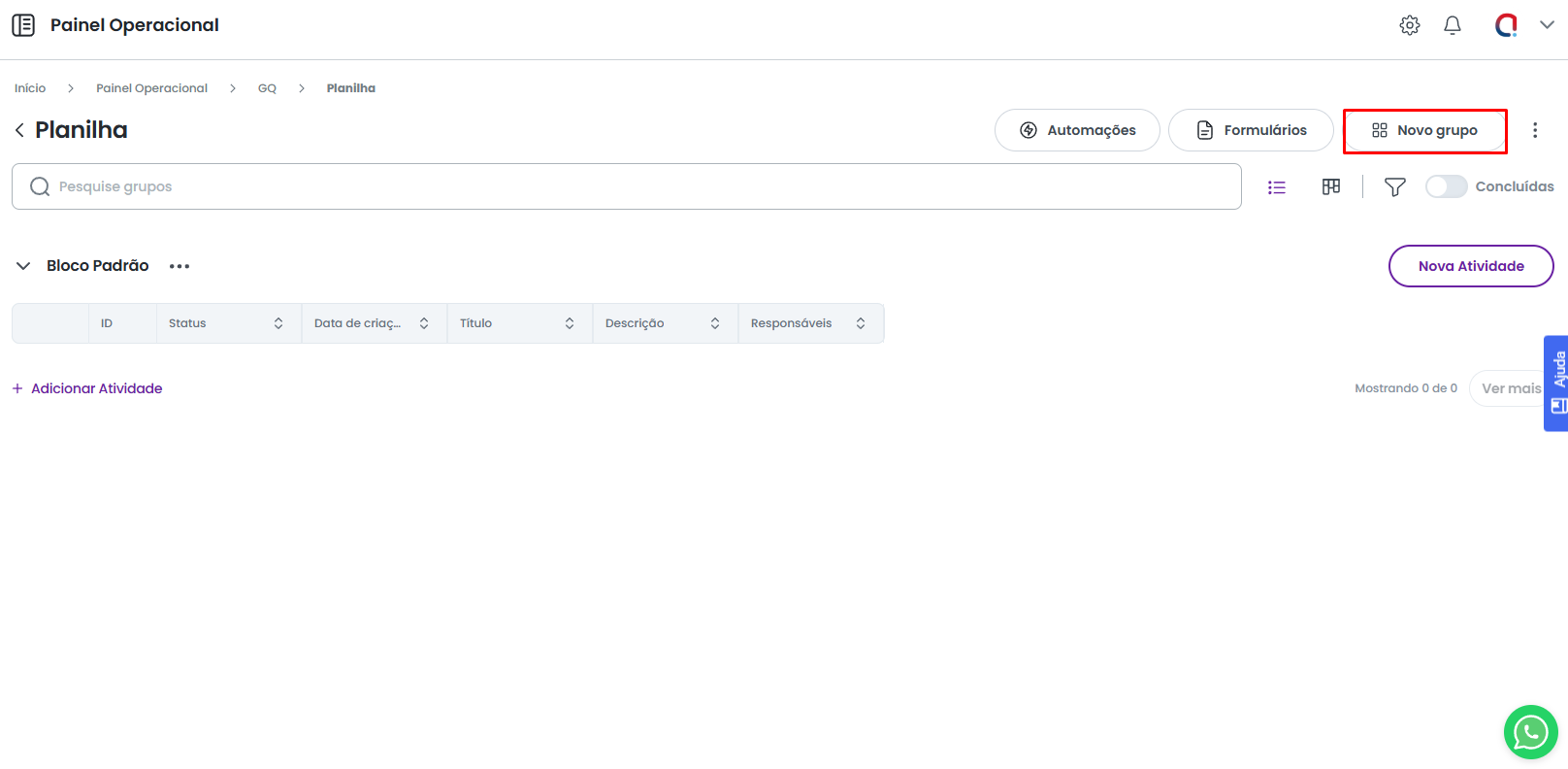 A opção Novo grupo permite ao usuário criar um novo agrupamento de atividades, que pode ser usado tanto para organização quanto para representar uma nova etapa no processo atual.