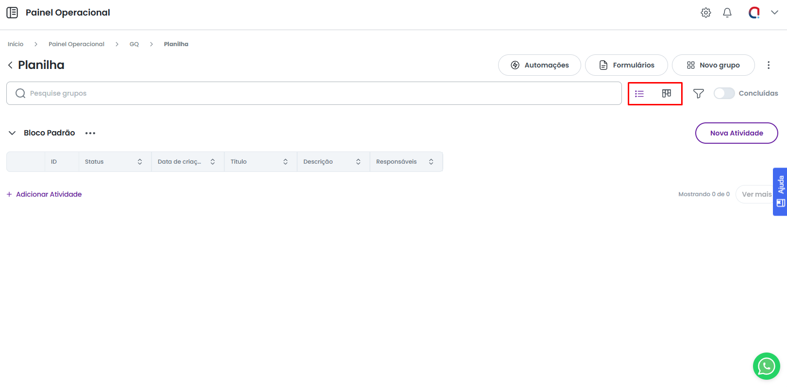 Localizada à frente da barra de pesquisa, o usuário tem a opção de alterar o modo de visualização da planilha, podendo escolher entre: Lista (o formato padrão da planilha) ou Kanban.