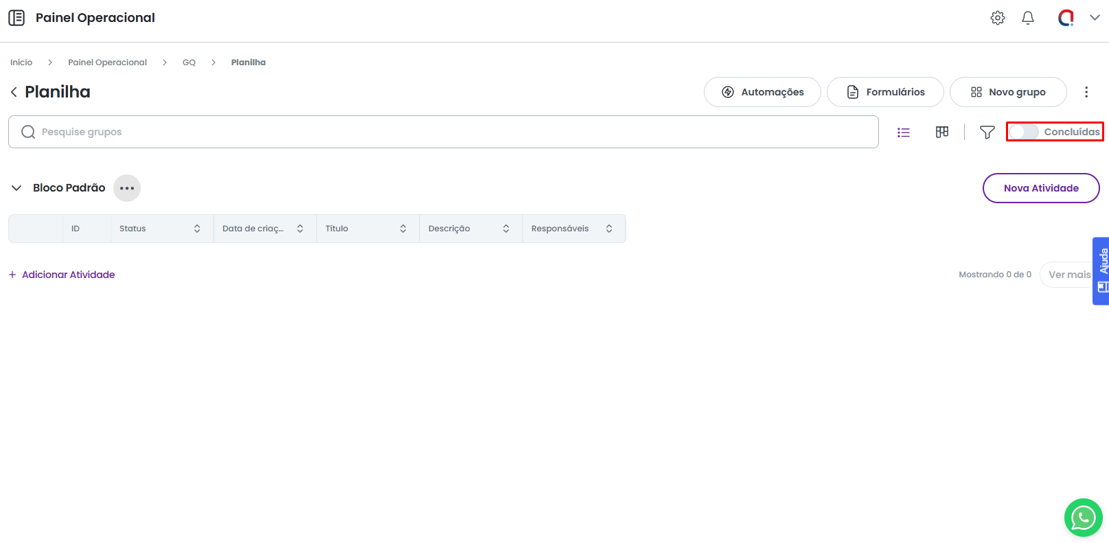 A opção Concluídas permite ao usuário visualizar as atividades que já foram finalizadas e marcadas como concluídas nesta planilha.