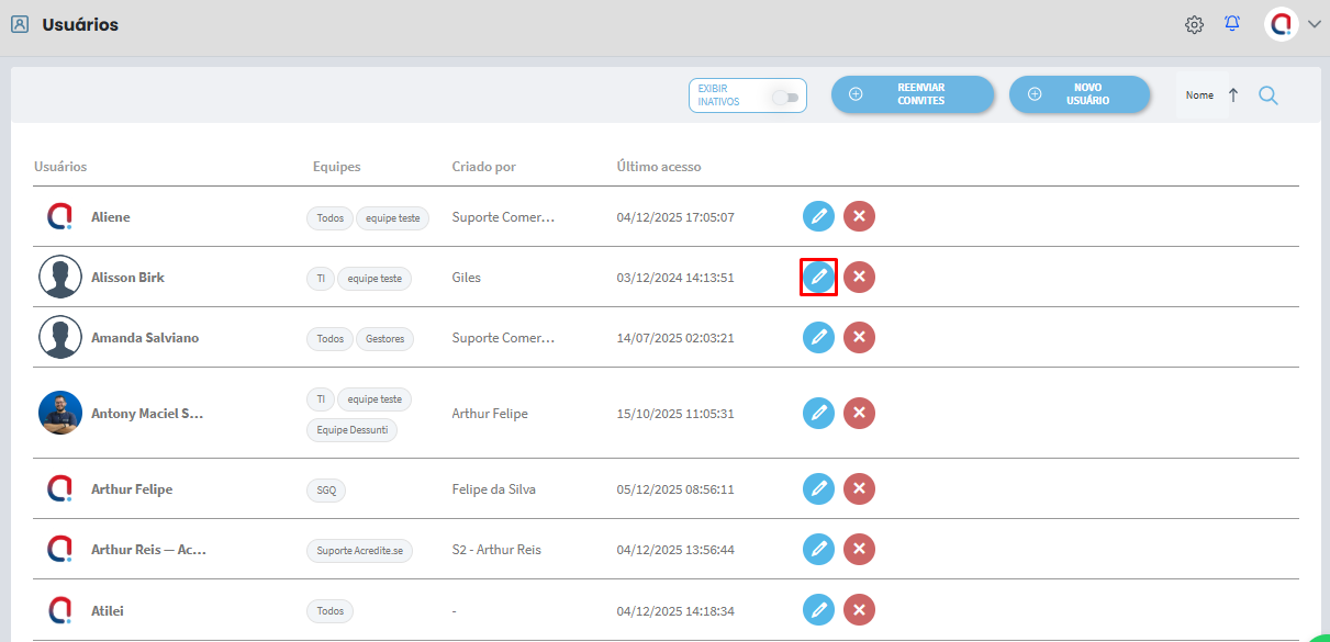 Utilizando a opção Editar, presente na lista de usuários, você pode modificar informações do usuário, como as equipes das quais ele faz parte ou os horários de acesso ao sistema. Você também pode desativar o acesso dele.