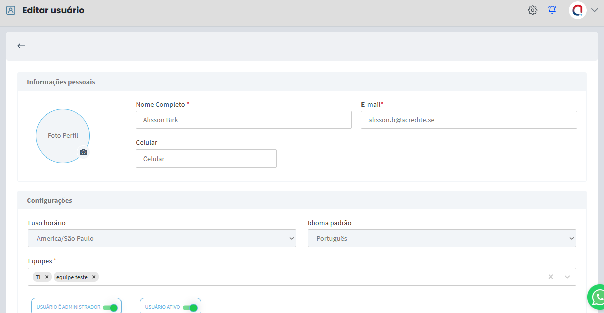 Ao desmarcar o checkbox Usuário ativo, o usuário será desativado e seu acesso ao sistema será bloqueado. Para desativar este item, é obrigatório migrar todas as responsabilidades deste usuário para outro.