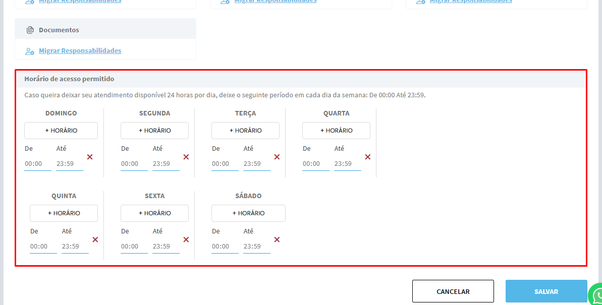 Caso o usuário não seja um administrador, será possível definir os horários de acesso dele ao sistema.