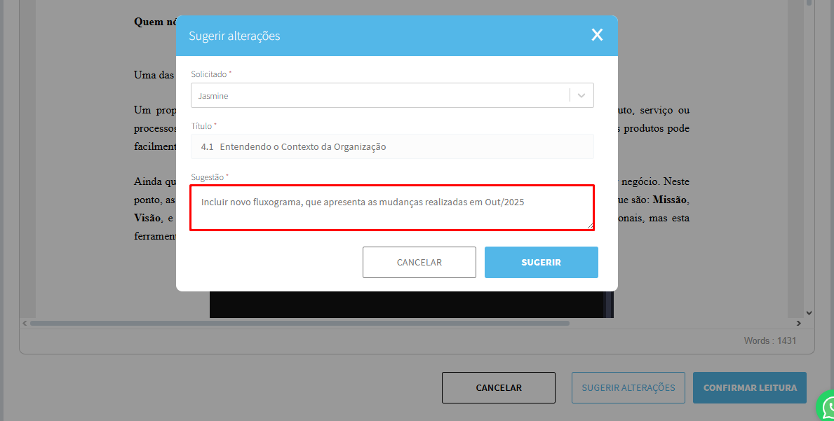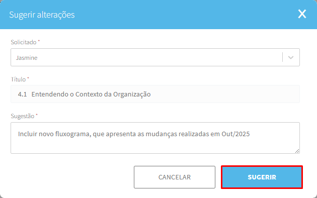 Após informar a sugestão, o usuário deve usar a opção Sugeir para enviar a sugestão ao responsável do documento.