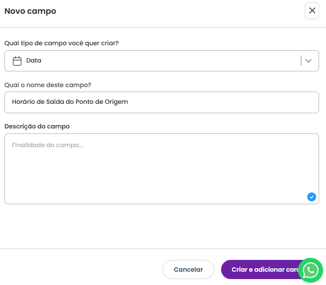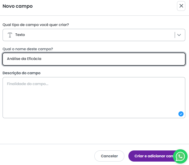 Confira abaixo os tipos de campo possiveis de serem criados no sistema: