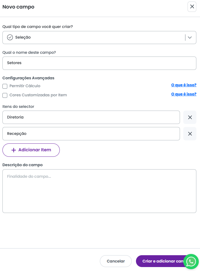 Durante a criação do campo, é possível ativar a opção Cores Customizadas por Item, permitindo atribuir uma cor de destaque a cada item da seleção.