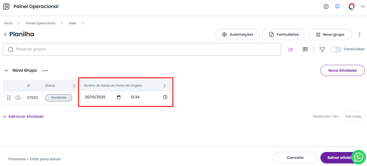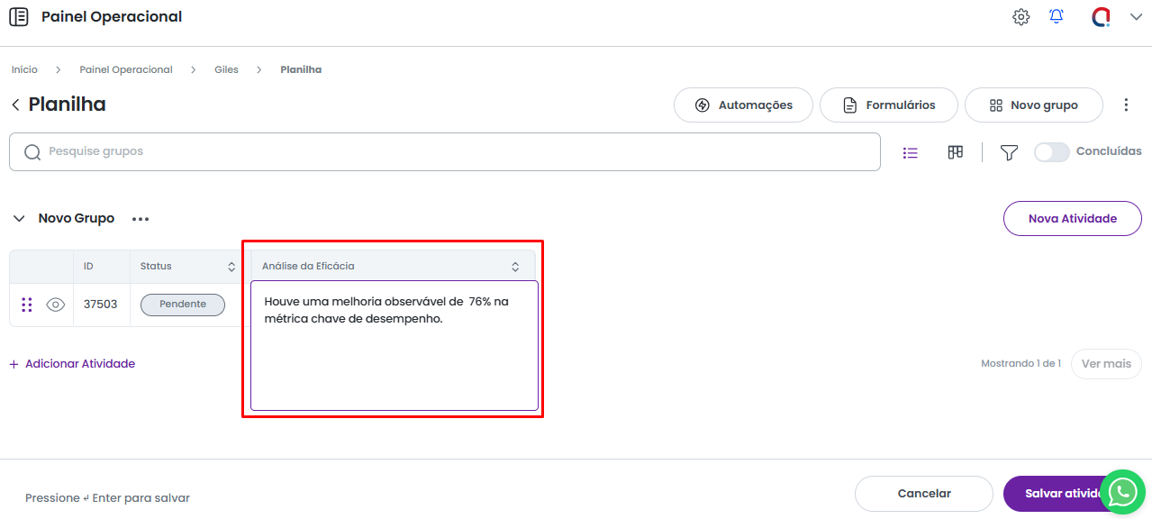 - Use as teclas Shift + Enter quando a atividade já estiver criada no sistema e a edição está sendo realizada pela grid.