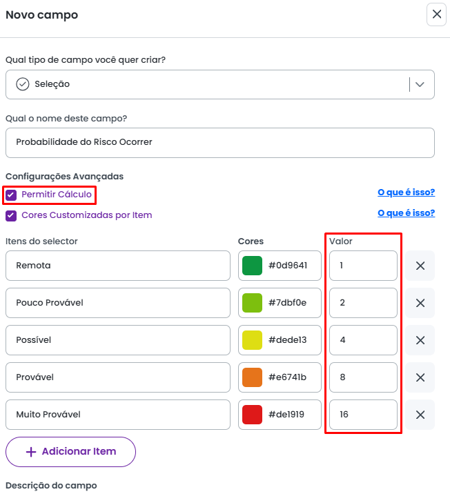 Além disso, é possível ativar a opção "Permitir Cálculo", que permite atribuir um valor numérico aos itens do campo. Dessa forma, será possivel utilizar essa seleção em um campo de Cálculo Matemático, possibilitando a realização de operações matemáticas com os valores dos itens selecionados.