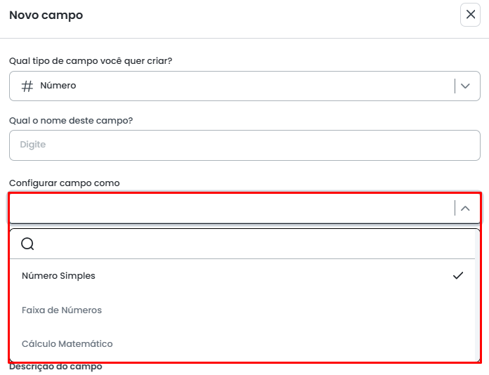 O campo de do tipo Número possui três configurações diferentes: Número Simples, Faixa de Números e Cálculo.