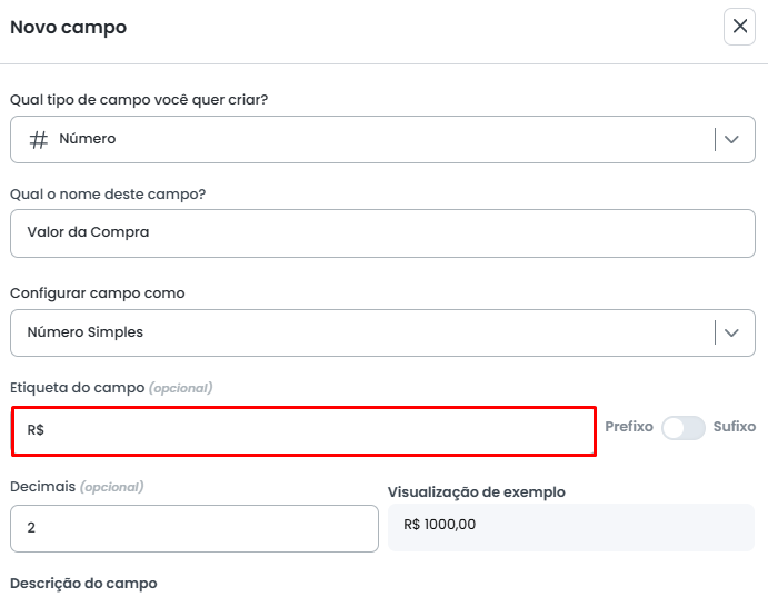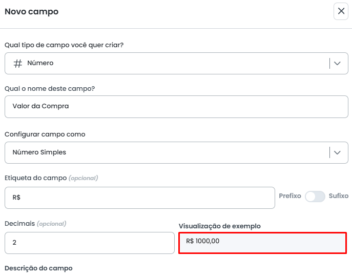 O sistema exibe uma visualização prévia do campo, localizada em frente à opção de Casas Decimais. Essa prévia demonstra o resultado final com as configurações aplicadas de etiqueta e a quantidade de casas decimais definidas.