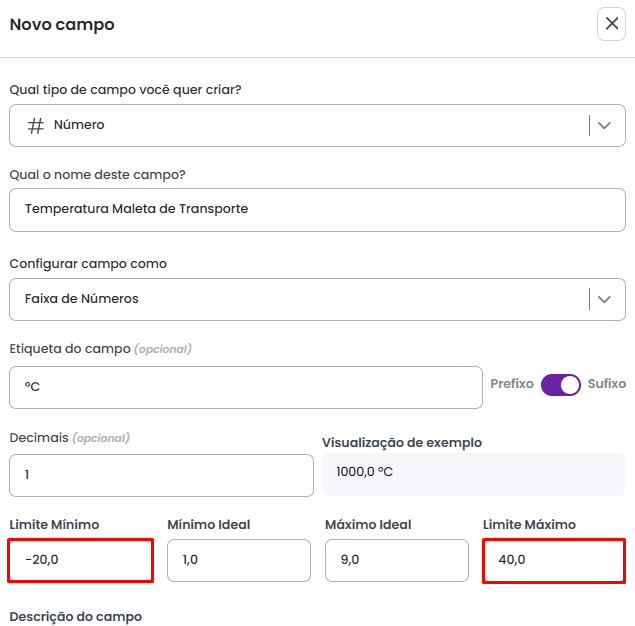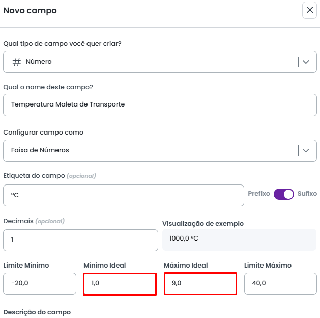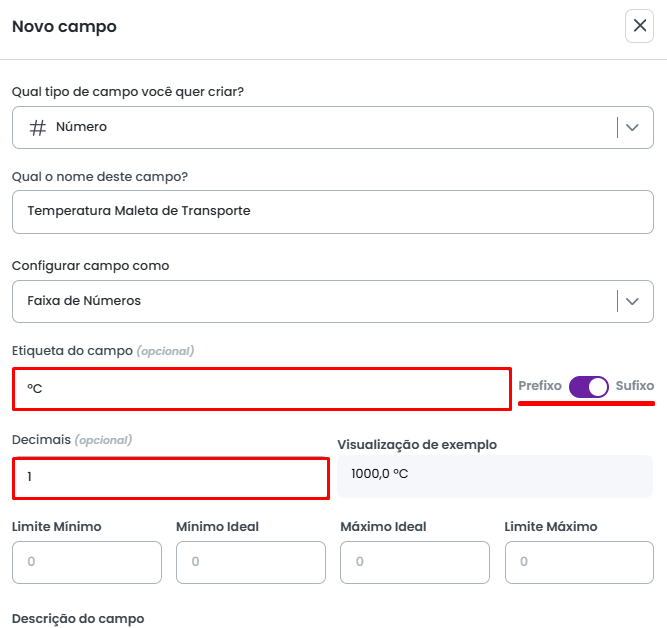 Utilizando a opção Etiqueta é possivel definir uma unidade de medida para o campo, como ºC, Kg, R$, %, mL ou Km. É possível definir essa etiqueta como prefixo ou sufixo, ou seja, que venha antes ou depois do número respectivamente.