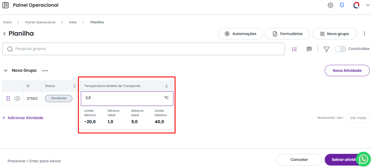 Durante o preenchimento da atividade, o intervalo ideal (Mínimo/Máximo Ideal) e os limites de validação (Limite Mínimo/Máximo) serão exibidos logo abaixo do campo para referência do usuário.
