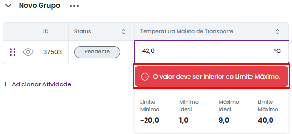 Quando o valor digitado ultrapassar esses limites extremos, não será possível salvar a atividade, garantindo a integridade dos dados e evitando a inserção de valores irreais (erros de digitação absurdos ou valores fisicamente impossíveis). Para definir esses limites, considere: