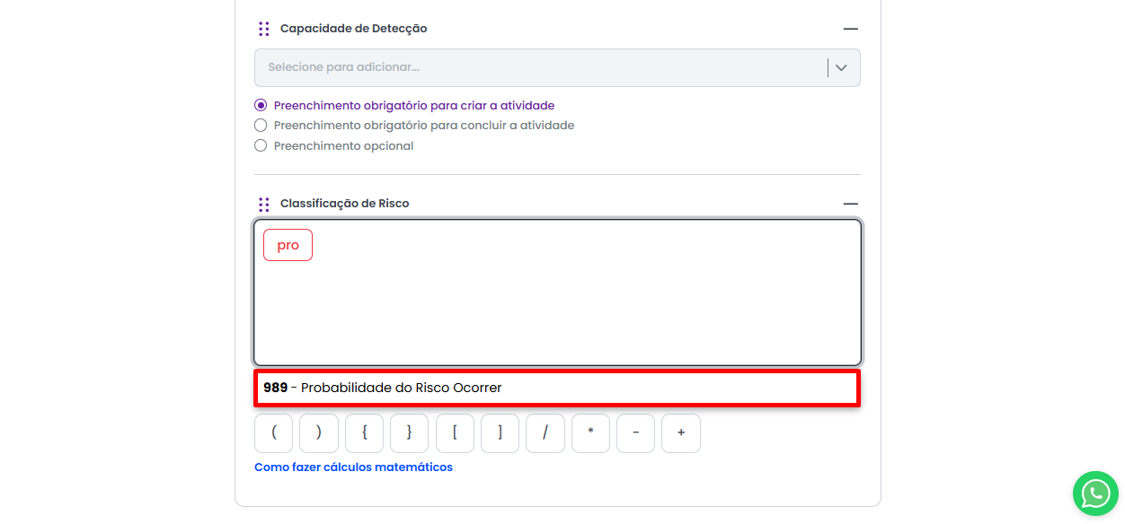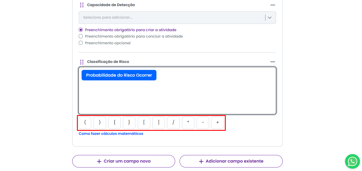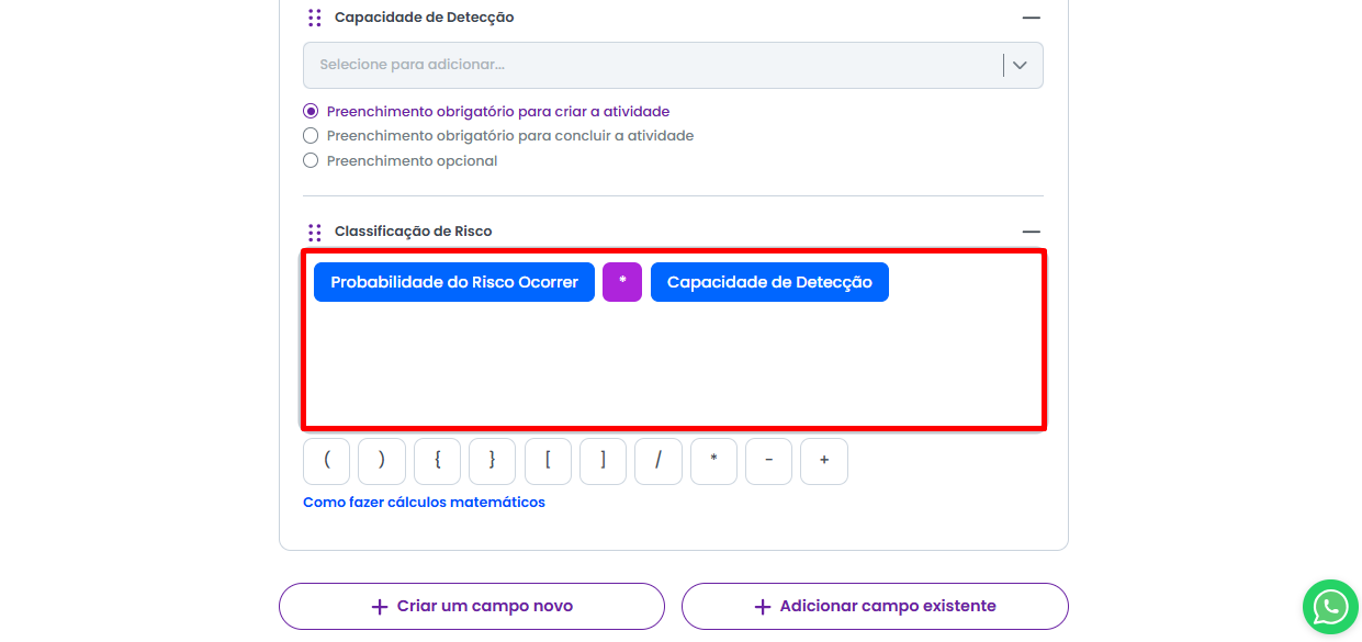 Ao ativar o campo de Cálculo Matemático dentro do Modelo de Atividade, você já poderá montar a operação matematica a ser realizada.