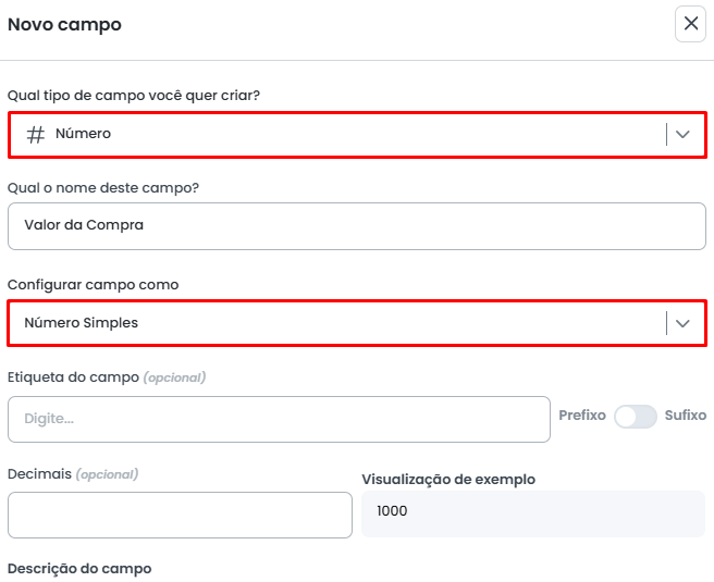 O campo de Número Simples é uma variação do campo do tipo Número. Para criá-lo, você deve selecionar o tipo Número e, em seguida, definir a variação para Número Simples após informar o nome do campo.