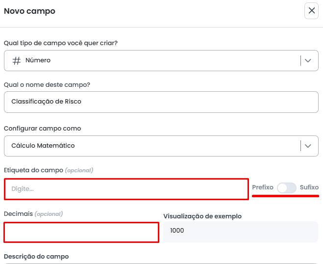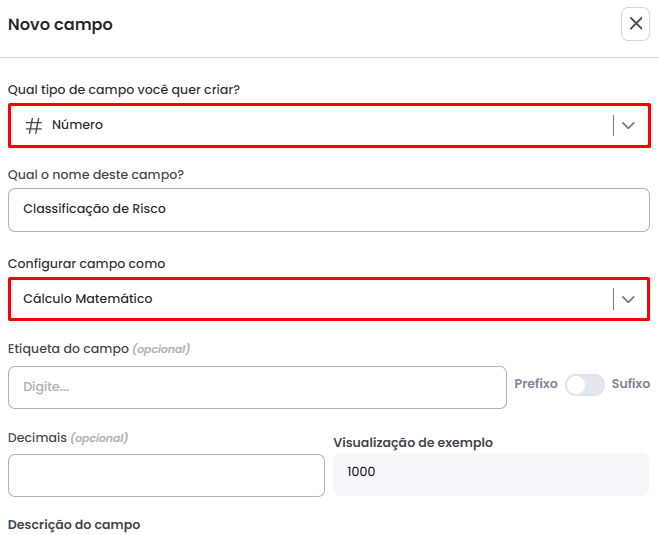 O campo de Cálculo Matemático é uma variação do campo do tipo Número. Para criá-lo, você deve selecionar o tipo Número e, em seguida, definir a variação para Cálculo Matemático após informar o nome do campo.